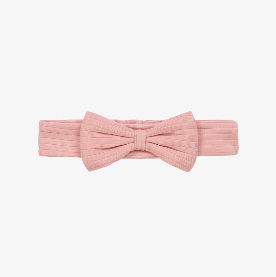 A super sweet pink headband for little girls by Kissy Love, made from soft ribbed Pima cotton jersey. A lovely accessory, it is decorated with a delightful bow on the front and has an elasticated back panel for added comfort.
