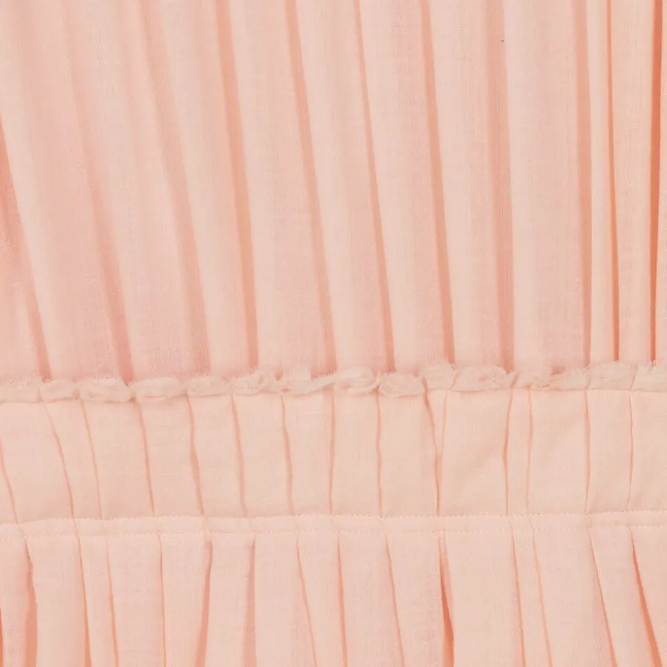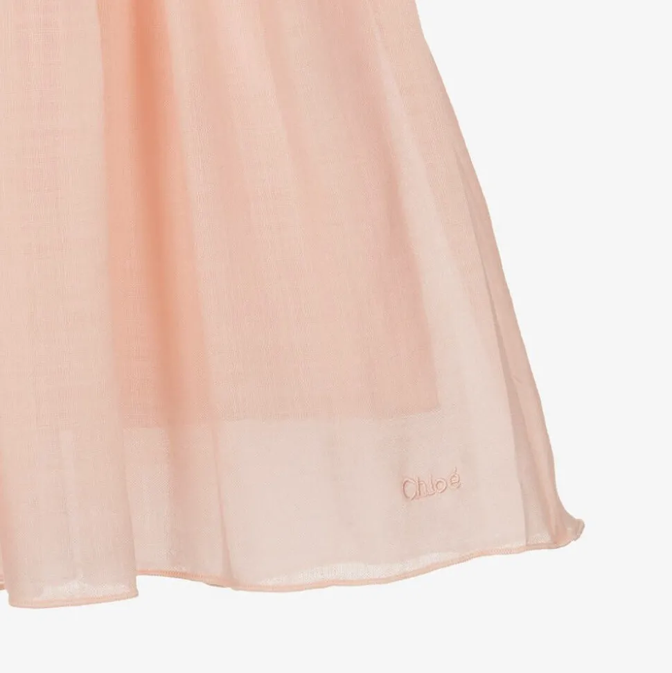 Smart pleated pink Mini-me dress for girls by luxury French designer ChloƩ, made in very lightweight wool with a subtle, embroidered logo by the hemline. It has a frilly, frayed, stand-up collar, a coordinating waistband and full, semi-sheer sleeves. Fully lined in lightweight twill for comfort, it has a neat, concealed zip fastening on the back.