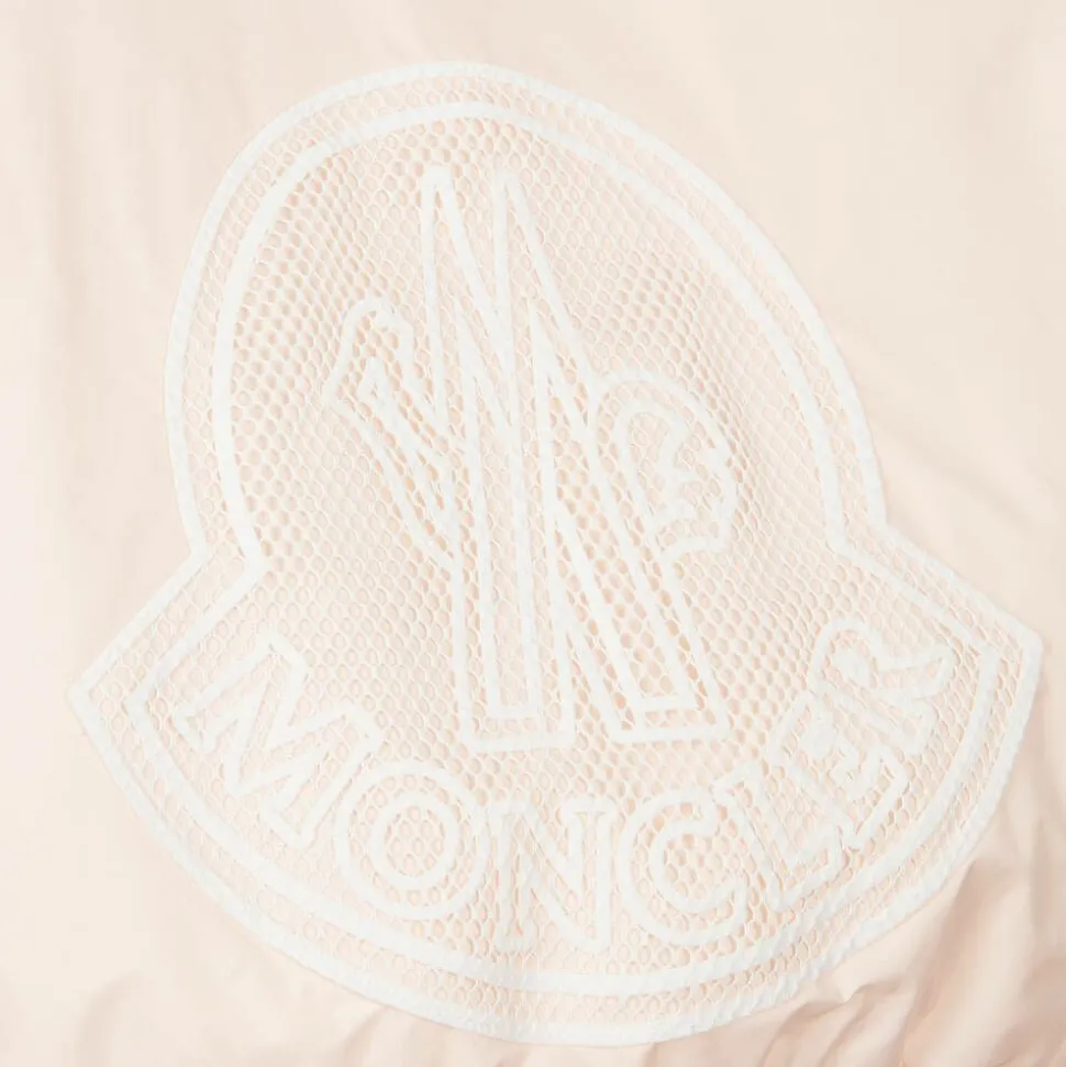 Pale pink windbreaker for girls by luxury brand Moncler Enfant, with a distinctive white mesh logo on the back. Silky smooth and water repellent, it is elasticated around the hood, cuffs and hem to help keep out chilly winds. It fastens with an exposed zip and has useful pouch pockets on the front. For a signature finish, the designer's iconic felt logo patch is appliquéd on one sleeve.