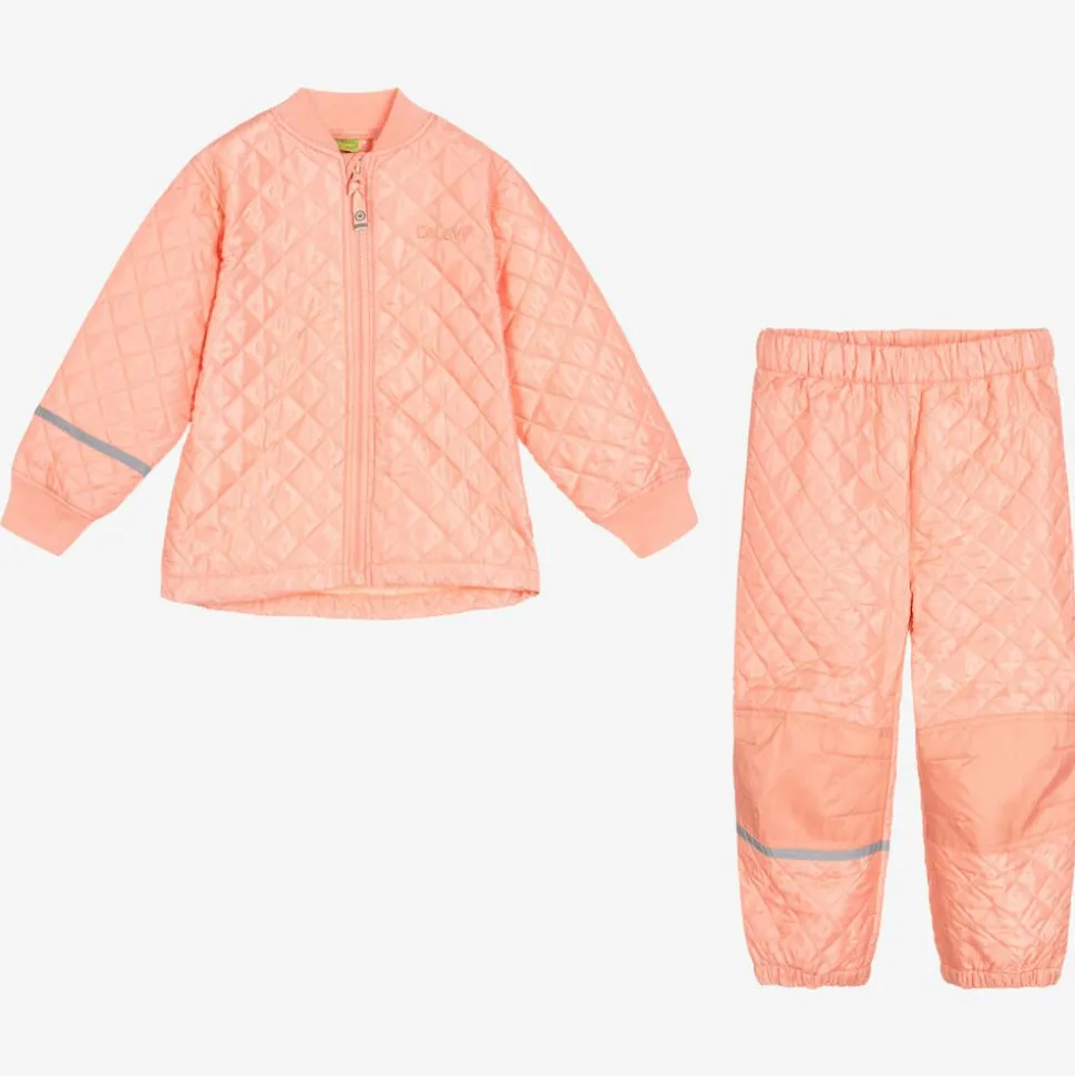 Coral pink quilted jacket and trouser set for girls by CeLaVi, with reflective trims. Made in soft quilted fabric, this windproof two-piece is designed to keep your little ones warm on windy days. The zip-up jacket has a ribbed collar, elasticated cuffs, and an adjustable toggle fastening on the hem. The matching cuffed trousers have reinforced panels on the knees and the bottom for extra durability, and an elasticated waist for a comfortable fit.