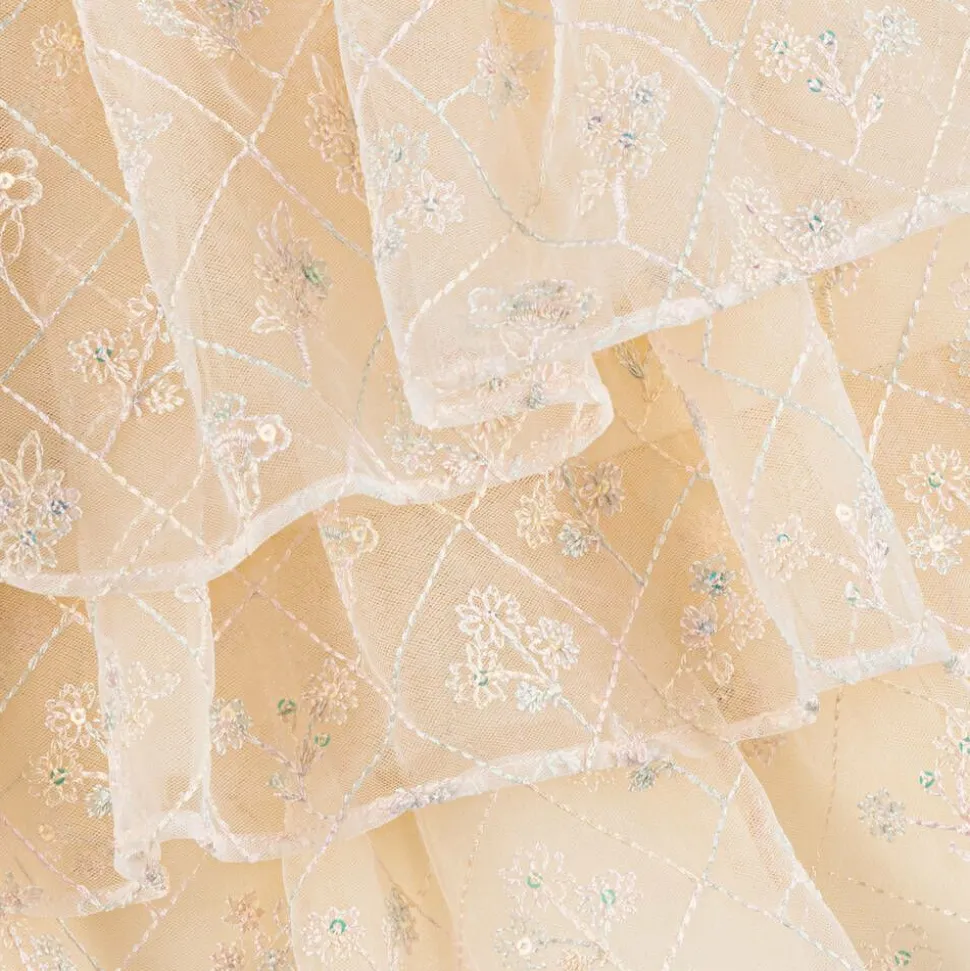 Shimmering dress for girls by EIRENE, designed with special occasions in mind. Made in sumptuous ivory satin with a pink tulle overlay, it is embroidered with a pink, blue and ivory diamond pattern, embellished in sequinned flowers that catch the light beautifully. It has a stand-up satin collar with a fixed bow below, matching the bows on the cuffs of the sheer, puffed sleeves. The tulle tiers on the skirt have layers of tulle below for extra volume and swish. Fully lined in voile for comfort, there is a concealed zip fastening on the back.