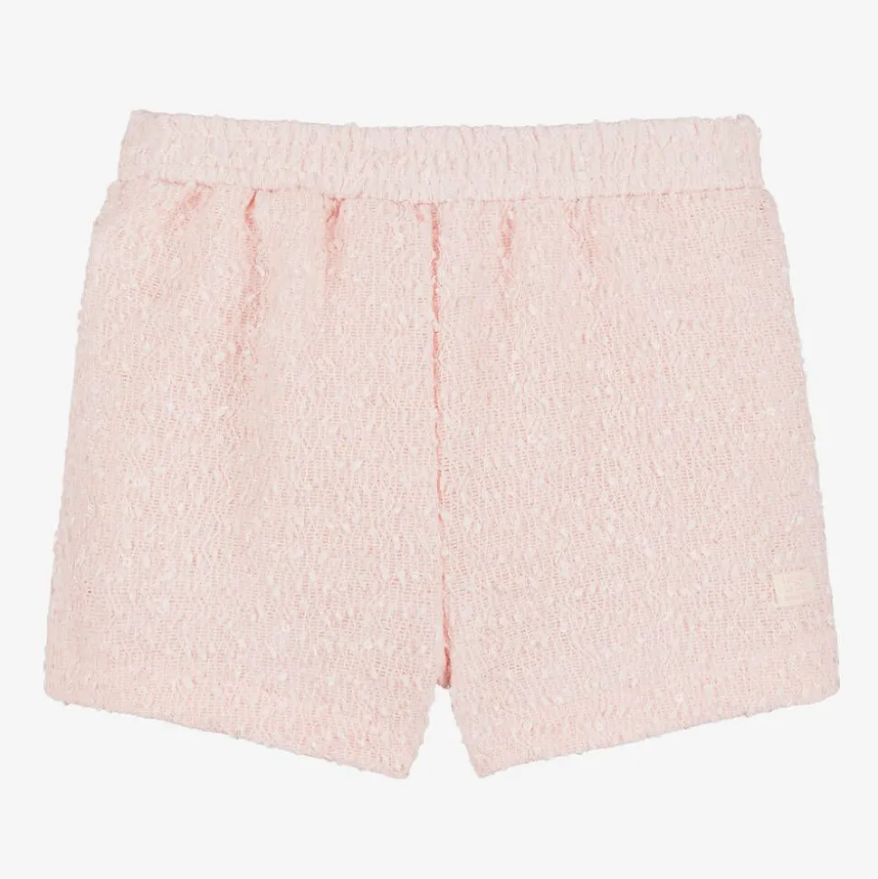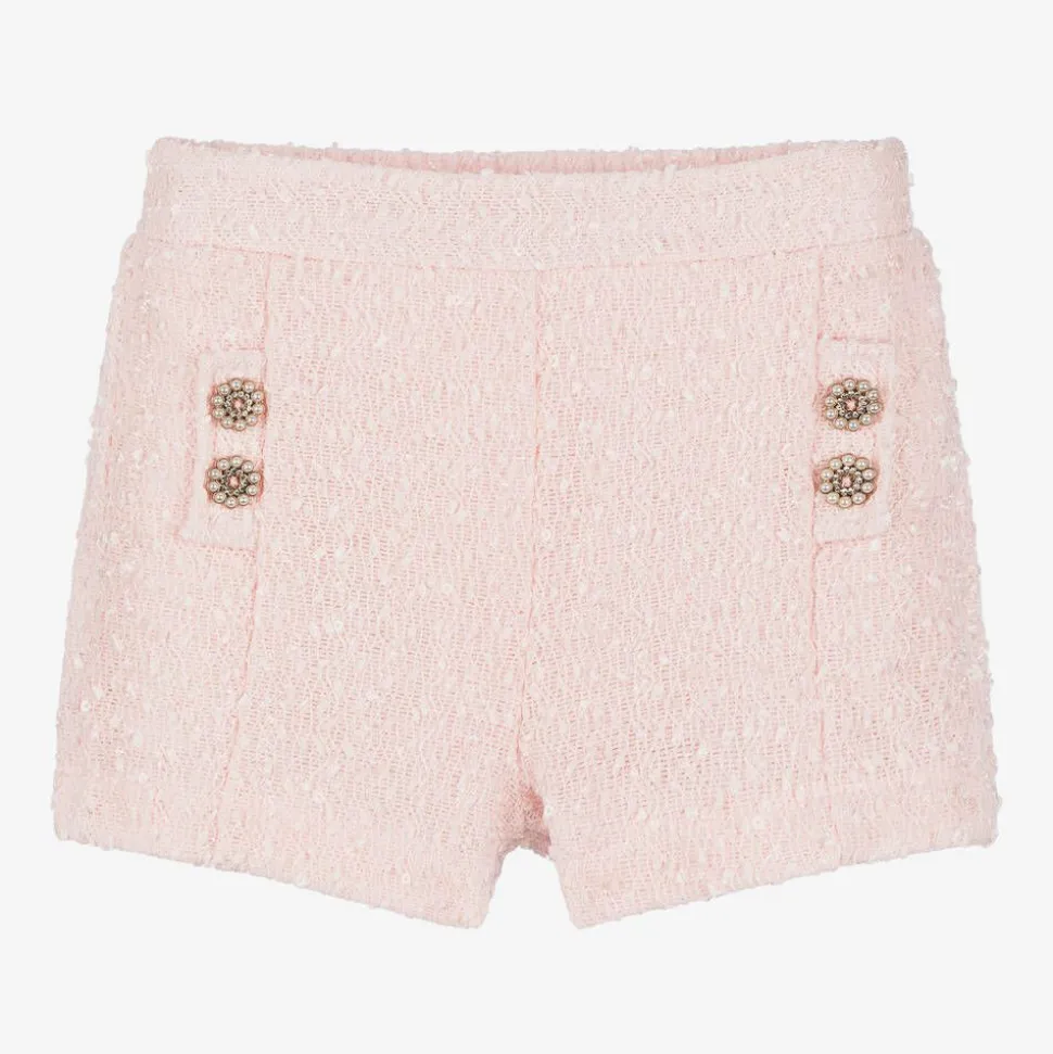 Smart pink shorts for girls by Le Chic, ideal for a special occasion. Patterned with wavy, fringed lines of shiny thread and scattered sequins that catch the light beautifully, they have stylish pearl bead and diamanté faux buttons on the front. For comfort, there is a satin lining and a semi-elasticated waistband. Easy to wear, they simply pull up.