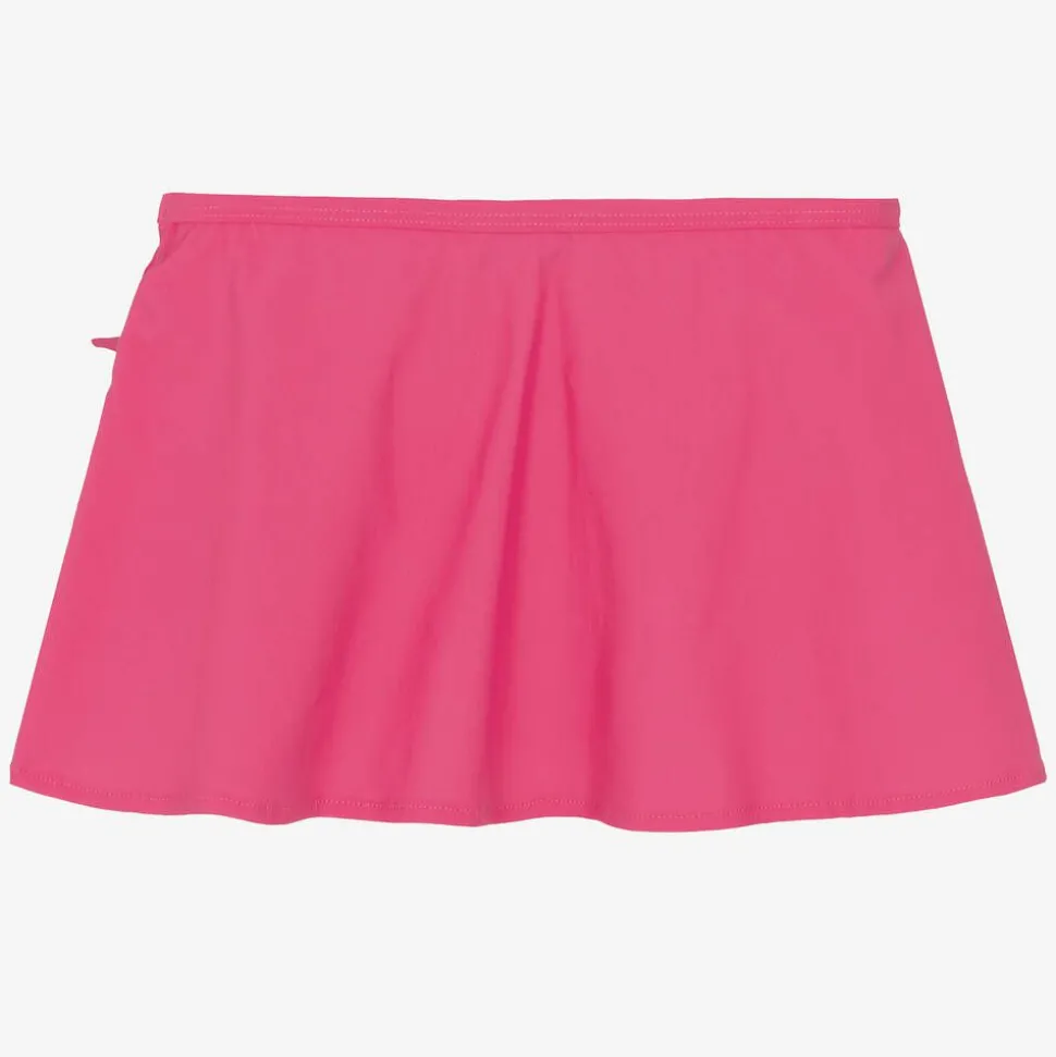 Exclusive to Childrensalon, this pink cover-up swim skirt for girls is by Mitty James, ideal for wearing over a swimming costume or bikini bottoms for additional cover at the beach or by the pool. Made in silky smooth and stretchy UPF 50+ fabric, it has a fixed bow and embroidered pink logo on one side. Easy to wear, it has an elasticated waist and simply pulls up.