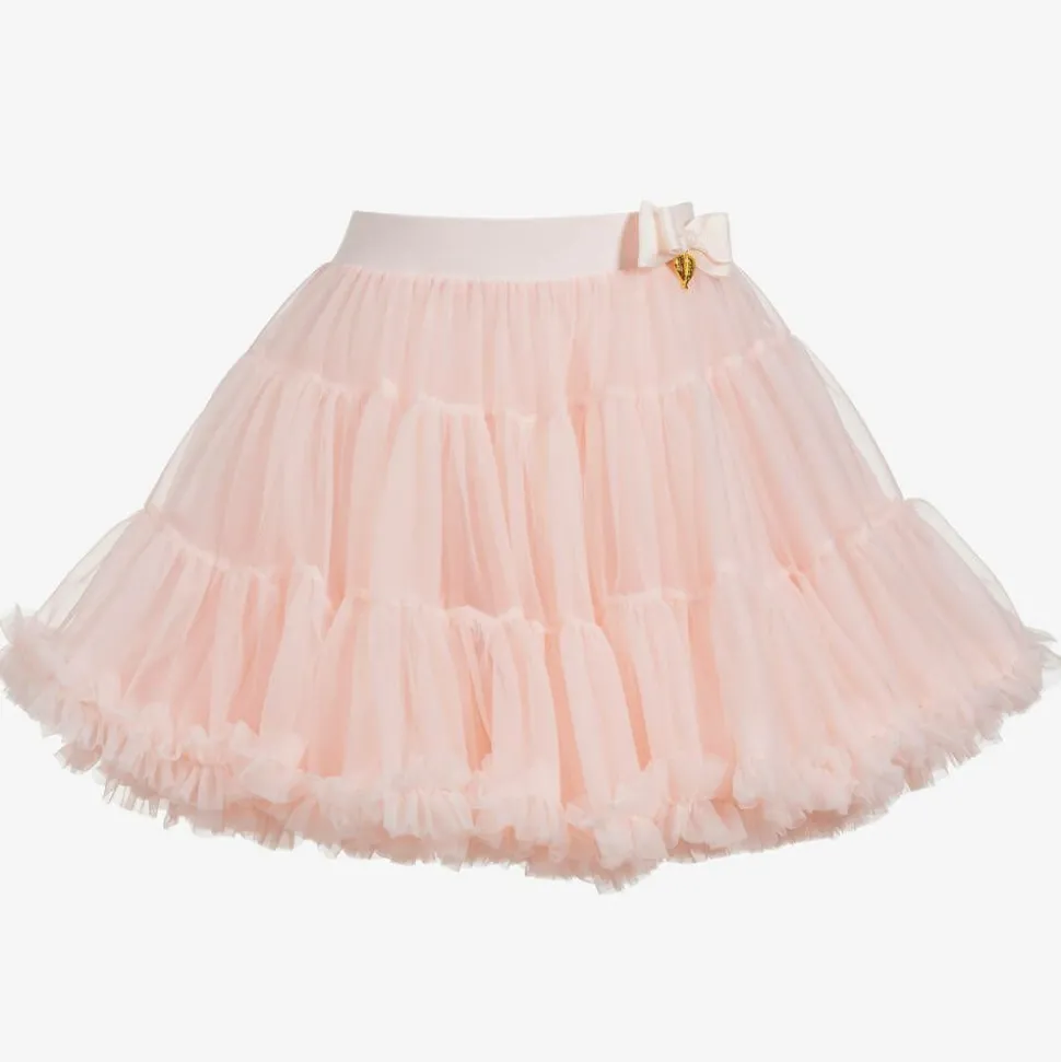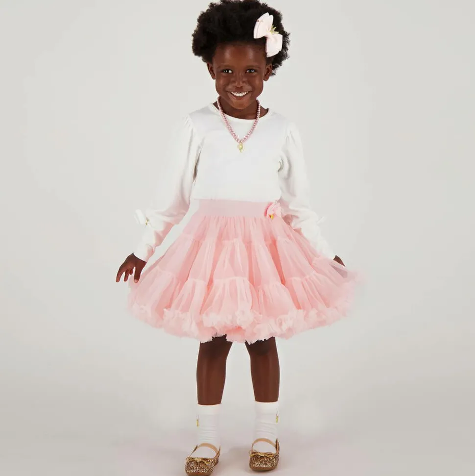 Girls pale pink tutu skirt by Angel's Face, made from layers of super soft tulle. Fully lined with stretchy cotton jersey for comfort, it has an elasticated waistband trimmed with the brand's golden logo charm.