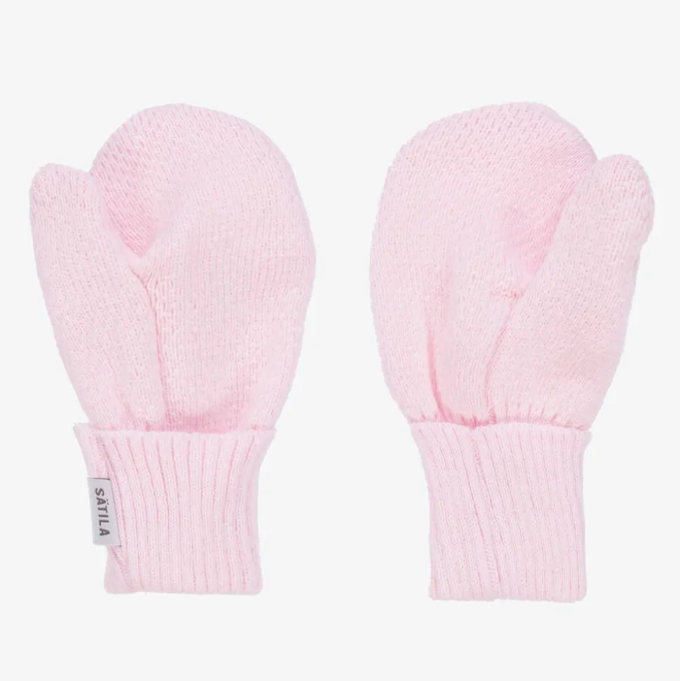 Super cute, these pale pink mittens for baby girls are by Sätila of Sweden. Great for keeping little hands warm, they are made from a soft knit with ribbed, turned-up cuffs.