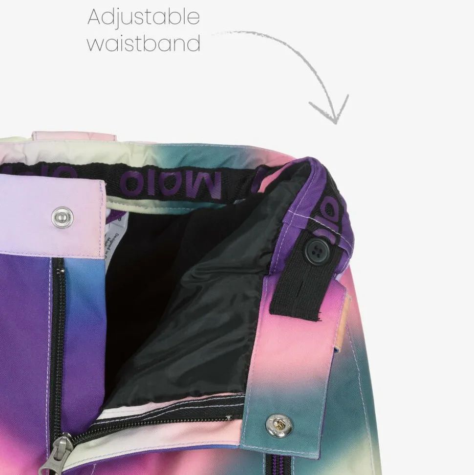 Padded pink, purple and blue wave print ski trousers by Molo, ideal for keeping girls dry, warm and visible on the slopes. Made in smooth, durable fabric from recycled materials, these breathable trousers have lightweight insulation and are lined in cosy fleece and satin, with taped seams. They have velcro cuffs with elasticated, popper-fastening internal gaiters and removable rubber stirrups. The waistband is adjustable for a great fit and has velcro-fastening belt loops. There is reflective detailing on one leg for visibility.