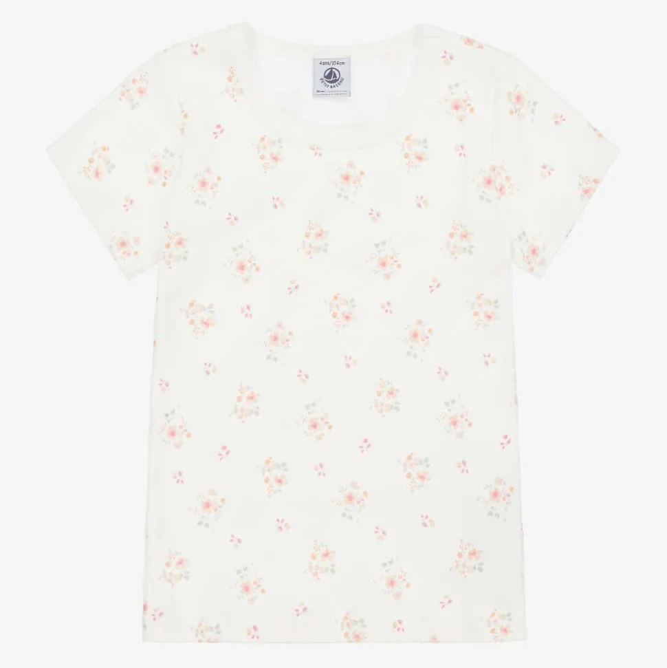 A two-pack of pale pink and white vests for girls by French brand Petit Bateau. Made in soft organic cotton jersey, each vest has short sleeves and picot embroidery around the neckline. One vest is plain pink with a delicate white bow and the other is patterned with a pretty floral print.