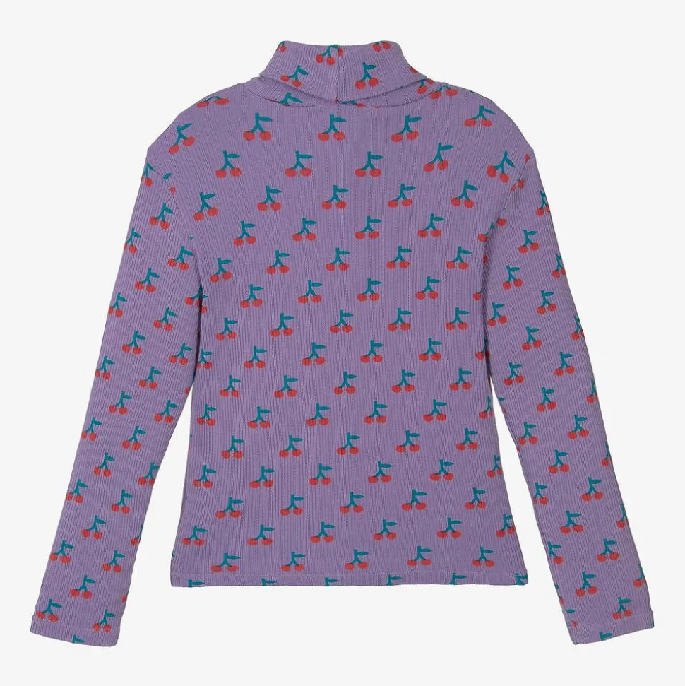 Girls purple organic cotton roll neck top by Bobo Choses, patterned with a fun and playful cherry design. Ideal for comfortable casual wear, this long-sleeved piece is made in soft and stretchy jersey.