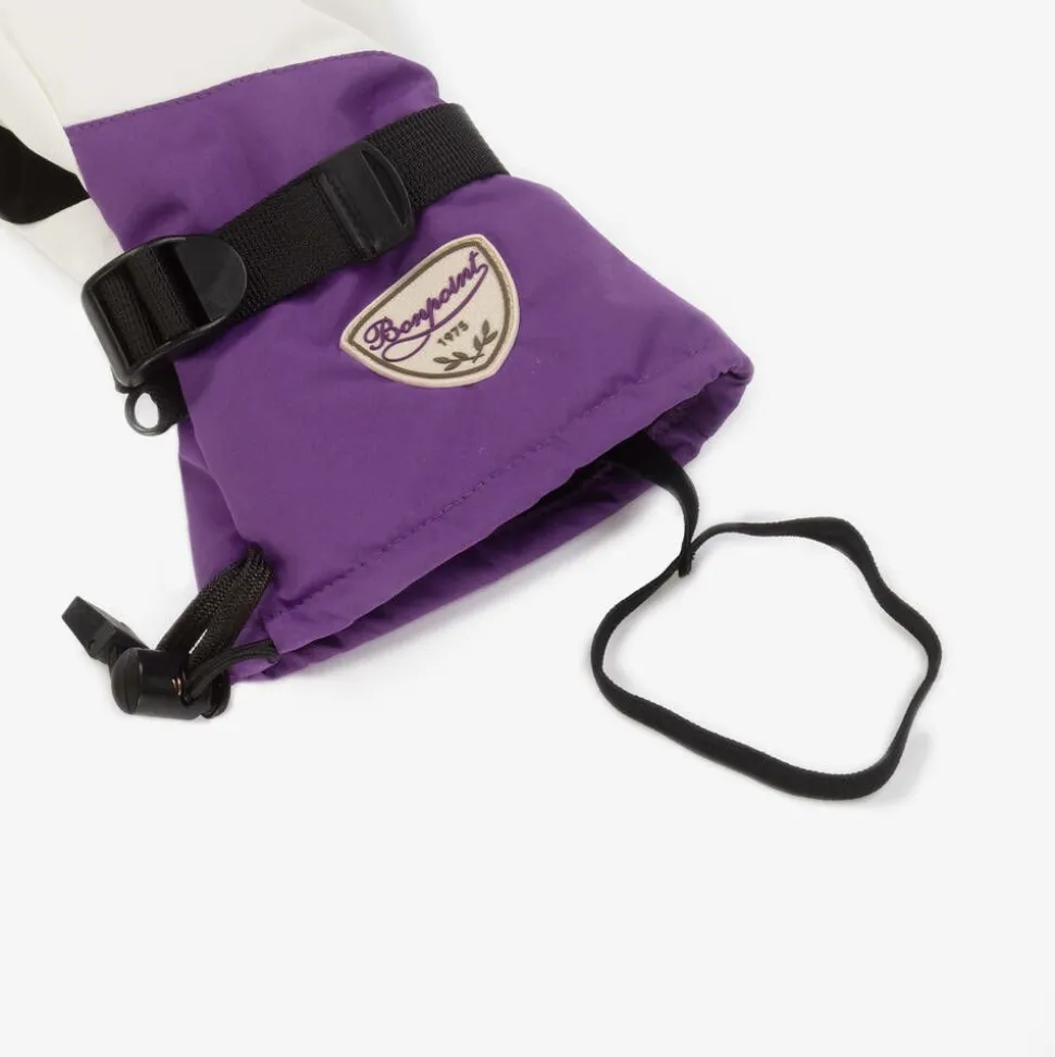 Stylish, padded ski gloves for girls by luxury French brand Bonpoint, in purple, green and ivory. Silky smooth, with a cosy fleece lining, they have black rubberised panels on the palm for added grip. An adjustable wrist strap and drawstring cuff create a secure fit and they can be clipped together for safe-keeping.