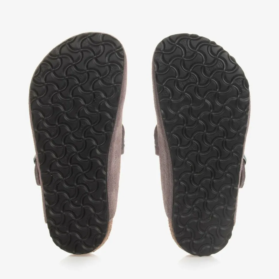 In faded purple, these suede leather Boston clog sandals for girls are by German designer Birkenstock. The narrow fit design has a single buckle-adjustable strap across the foot for a comfortable fit, with an anatomically shaped suede footbed providing support. There is a natural cork midsole for that classic Birkenstock look, with ultra-lightweight treaded soles for a sure footing. Branded metal hardware adds a finishing designer touch.