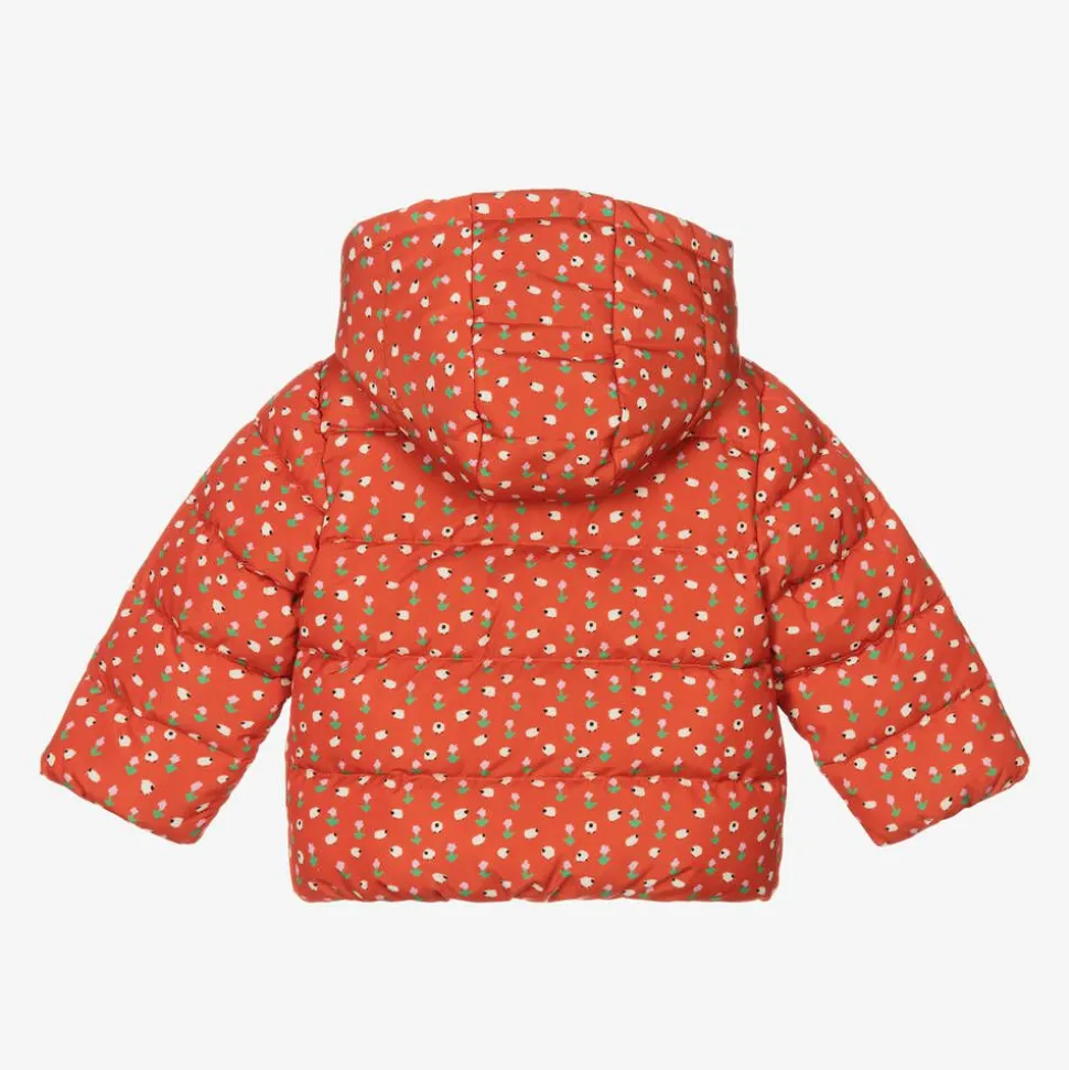 A cheerful flame red zip-up puffer jacket for little girls by Stella McCartney Kids. Super smooth with mid-weight padding, it is printed with tiny sheep and pretty pink and green flowers for a fun finish. Lined in soft fleece for added cosiness, it has slanted pockets and a hood that detaches with a zip for an alternative look. The Stella McCartney fit can be quite small so choose a size up if you want room to grow.
