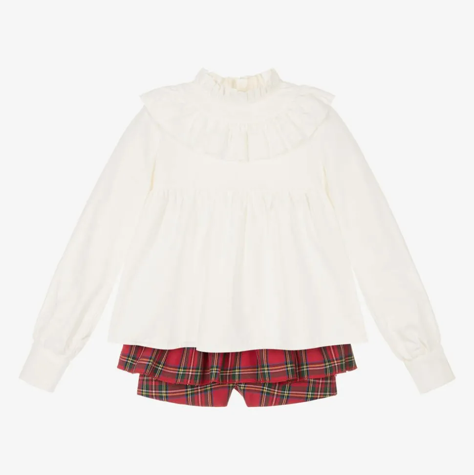 Lovely ivory and red cotton shorts set for girls from Abuela Tata. Trimmed with ruffles, the lightweight twill blouse has long sleeves with buttoned cuffs, a gathered bodice for a full shape and pearlescent button fastenings on the back. To complete the traditional look, it comes with a tartan skort. Lined for comfort, it has a partially elasticated waistband with an attached full skirt and matching buttons to fasten on one side.