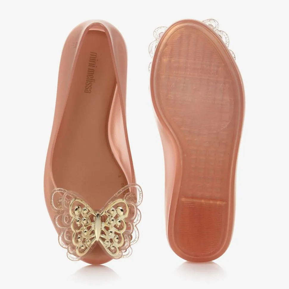 Rose gold ballerina pumps for girls by Mini Melissa, adorned with a beautiful gold butterfly on the toe. Made in the brand's signature Melflex material with a gorgeous sheen, these special occasion pumps are lined in a super soft, cushioned insole for comfort. The flexible outer sole is ridged to improve grip.