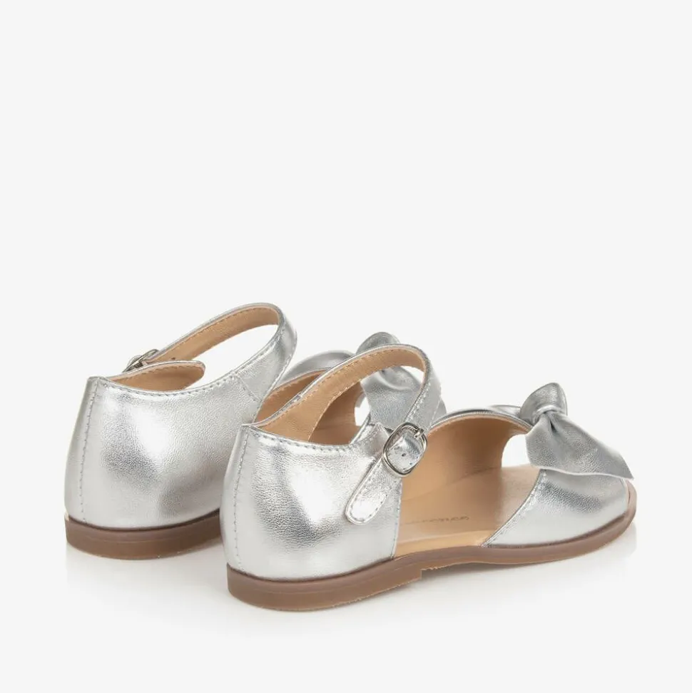 Sweet and elegant, these silver sandals for girls by Age of Innocence are trimmed with beautiful bows over the toes. Handcrafted from smooth metallic leather with soft leather lining, they fasten neatly with a buckle-fastened strap around the ankle. They have a lightly padded insole for extra comfort and a slim brown non-slip rubber outsole for better grip.