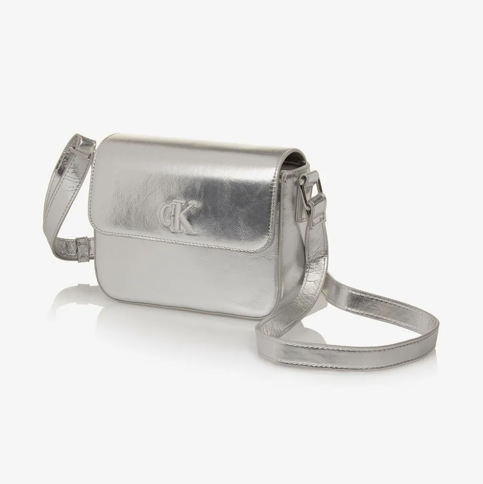 Timelessly stylish silver faux leather handbag for girls from Calvin Klein. A tonal embroidered logo on the front and silver metal work give a sophisticated finish.