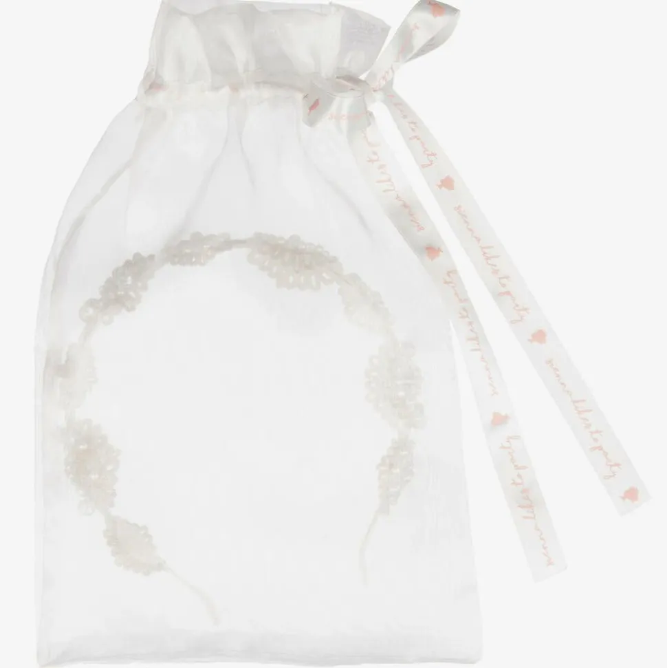Girls handmade ivory satin covered hairband by Sienna likes to party. It has pretty silver lace flowers covered with clear and pearl beads.