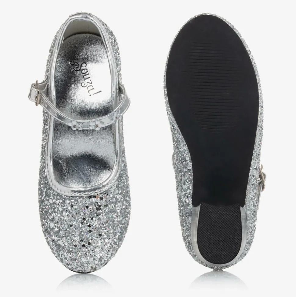 Girls silver faux leather bar shoes by Souza, with sparkling, glitter-coated uppers. Ideal for parties, these eye-catching shoes have a strap across the foot which is embellished with pretty, beaded flowers and a shiny silver ribbon bow. The buckle fastening can be adjusted for a good fit. With a low block heel, they have a metallic silver insole and a black non-slip rubber sole.