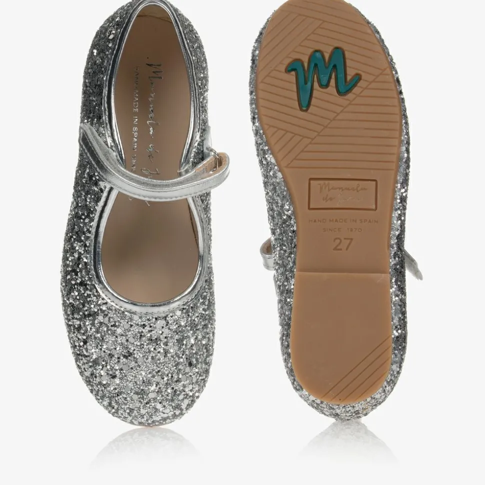 A pretty pair of Manuela de Juan silver glitter leather pumps in a Mary Jane style. Beautifully handmade in Spain, these lovely special occasion shoes have a soft leather trim, lining and a rubber sole, with easy to fasten velcro straps.
