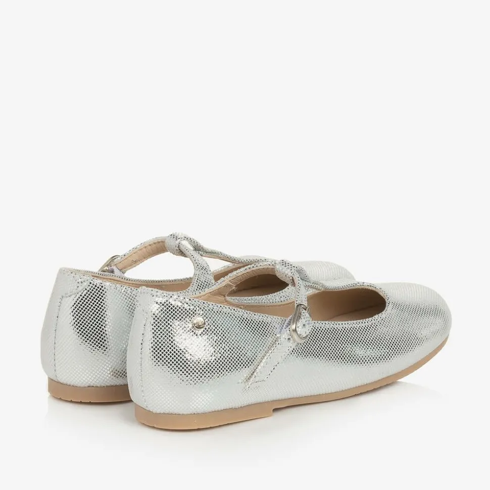 Manuela de Juan girls silver pumps made from a super soft leather. Handmade in Spain, these T-bar shoes have a soft leather lining, an adjustable buckle fastening strap and a rubber sole.