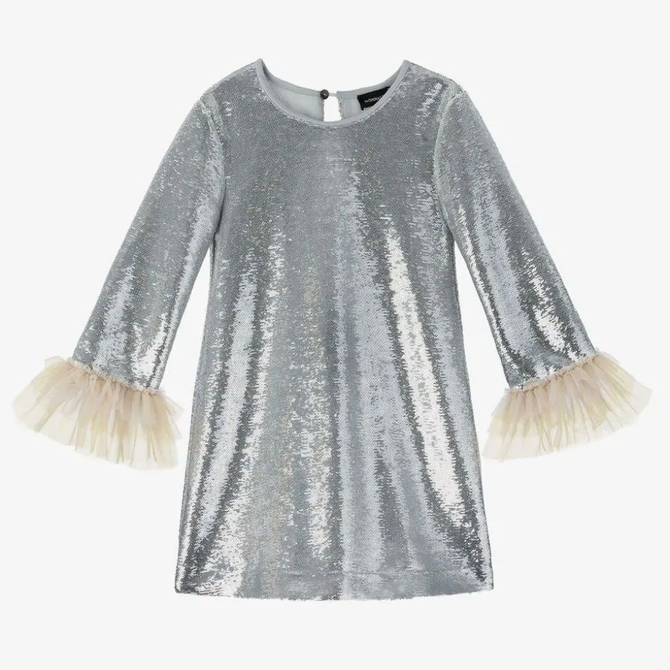 Beautiful silver dress for girls by Monnalisa, ideal for dazzling at a party. Covered in sequins, this stand-out style has a straight silhouette, long sleeves and a lightweight mesh lining. Beige tulle flutters decorate the cuffs for a fabulous look. On the back, there is a contemporary cut-out opening and simple button fastening.