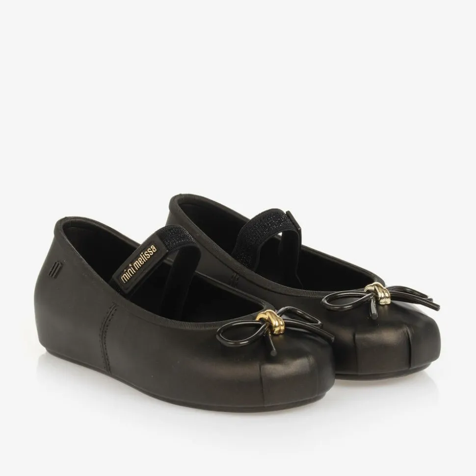 Dark brown jelly shoes for little girls by Mini Melissa, made in the designer's signature Melflex material. These bronze-effect shoes are designed like a ballerina pump, with a sparkly, elasticated strap across each foot for improved support. The padded foam insole ensures a comfortable fit, and the ridged outer sole helps with grip. A bow and metallic gold accent completes the look with a pretty finishing touch.
