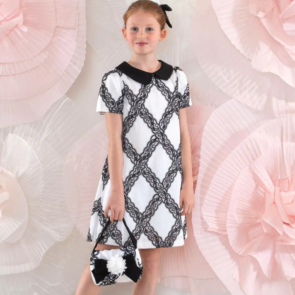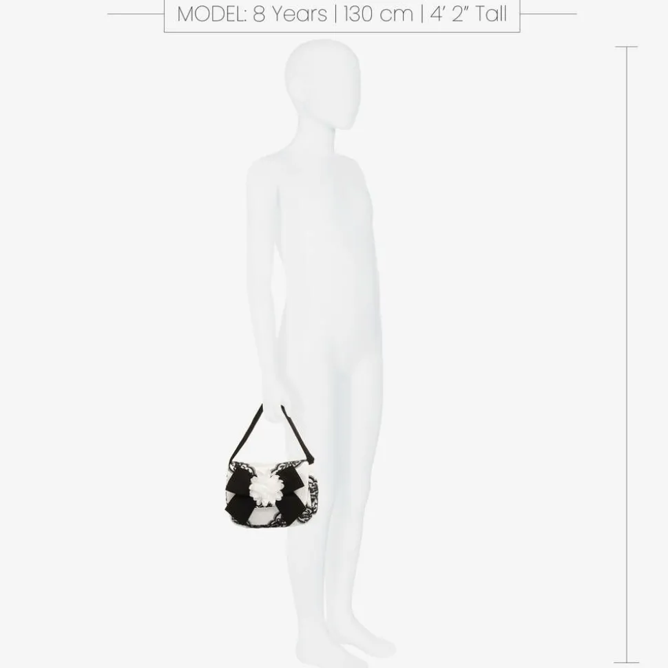 Exclusive to Childrensalon, this stylish white satin handbag for girls by Patachou, is elegantly patterned with black lace. A lovely accessory for a special outfit, the single compartment is lined in soft cotton. It secures with a popper and is trimmed on the front with a black chiffon bow and beautiful white flower appliqué.