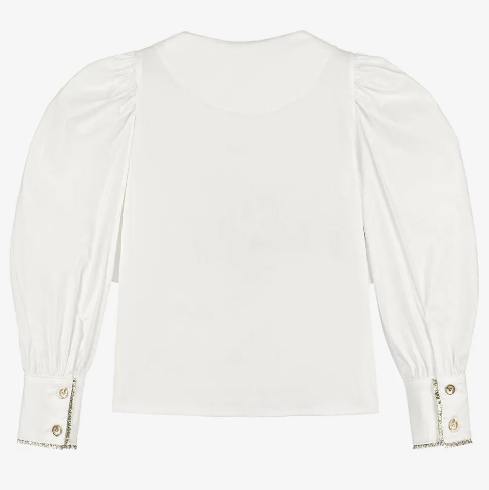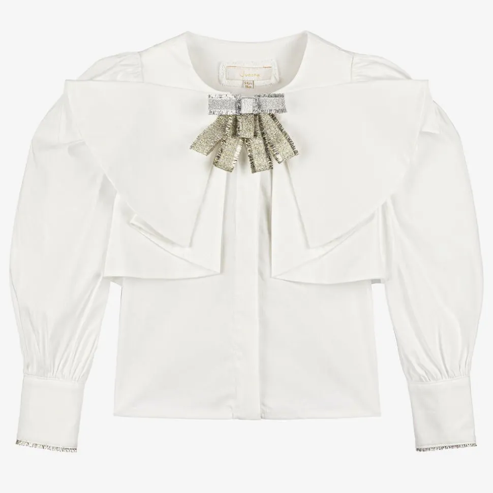 Off-white blouse for girls by Junona, made in soft and lightweight cotton. Lovely for smart occasion wear, this button-up blouse has oversized ruffles on the bodice and a detachable glitter bow on the neckline in gold and silver shades. The same metallic fringing can be seen around the buttoned cuffs for extra detailing. The fabric is gathered on the shoulder, adding fullness to the long sleeves.