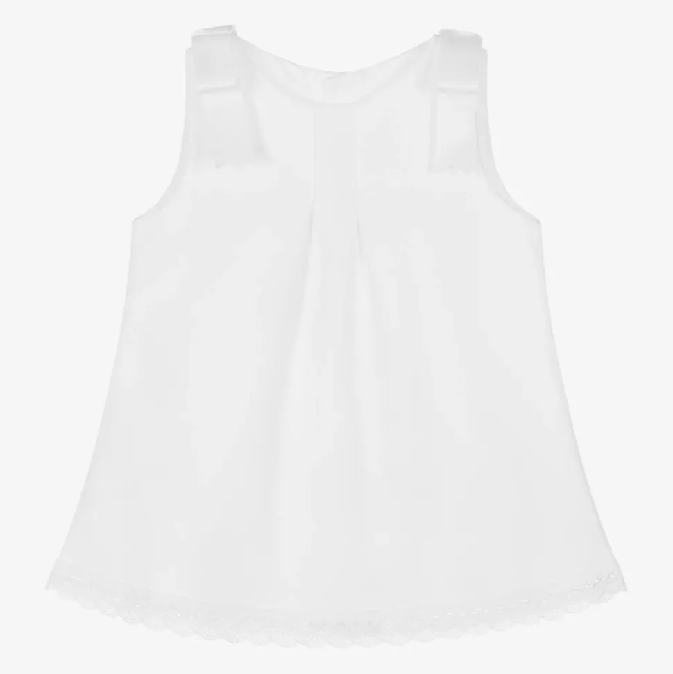White sleeveless dress for little girls by Spanish brand Mebi, made in soft waffle-textured cotton. This charming dress has a pretty lace trim around the hem and removable satin bows on the shoulders. It has pintuck pleats on the front and fastens with mother-of-pearl buttons on the back. Mebi is a very small fitting brand, please choose a size up to allow room to grow.