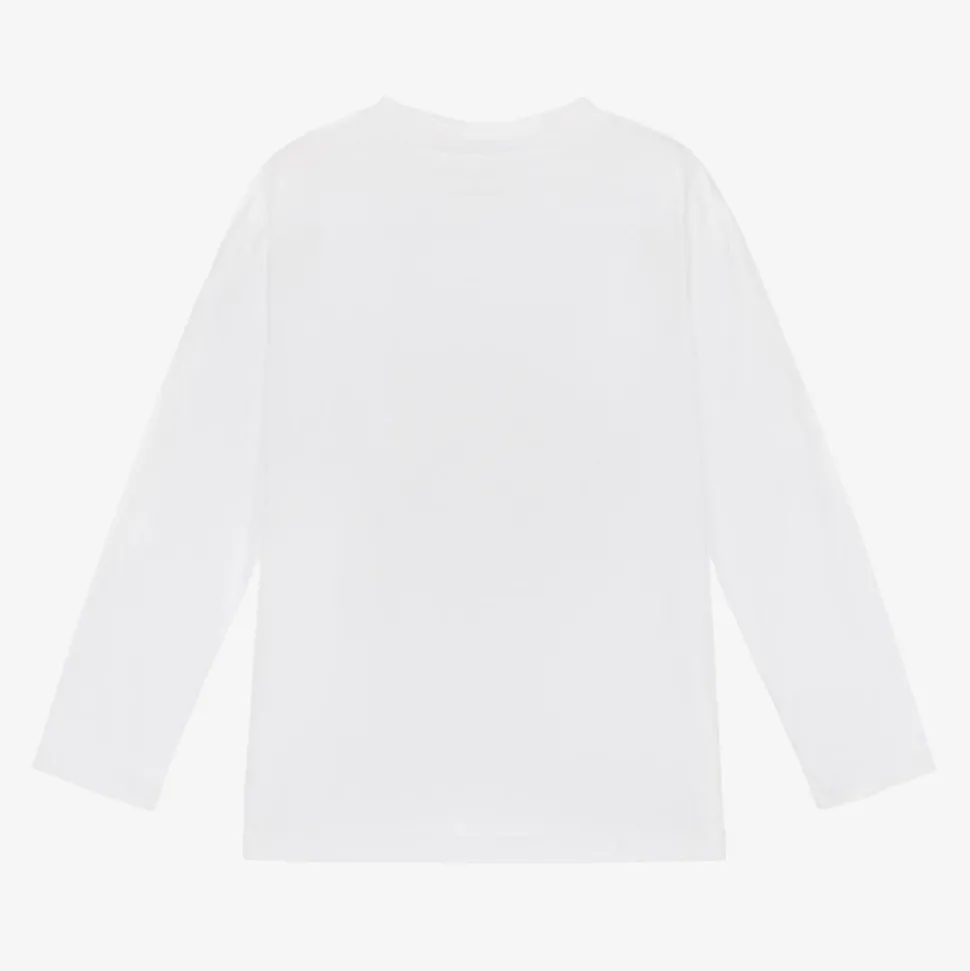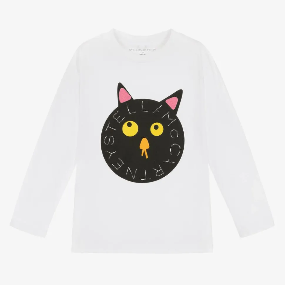 White long-sleeved top for girls by Stella McCartney Kids, made in soft jersey. Ready for Halloween, this casual top has a fun black cat face on the front, with felted ears, eyes and nose and the brand's signature dotted logo. The Stella McCartney fit can be quite small so choose a size up if you want room to grow.
