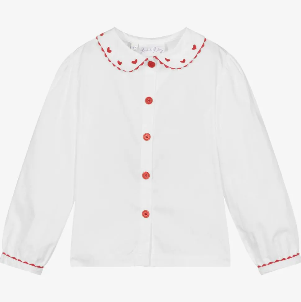 Lovely off-white cotton blouse for girls by British brand, Rachel Riley. The rounded collar and cuffs are trimmed with red scalloped detailing, and the collar has embroidered red hearts for a cute look. It fastens with matching red buttons on the front for a classic look.
