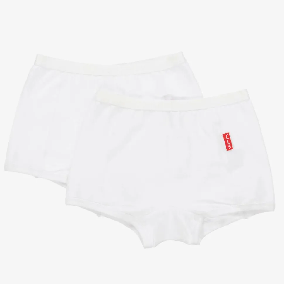 Pack of two white boxer-style knickers for girls by Claesen's, made in soft and stretchy cotton jersey. Comfortable and easy to wear, they have a tonal logo branded waistband.