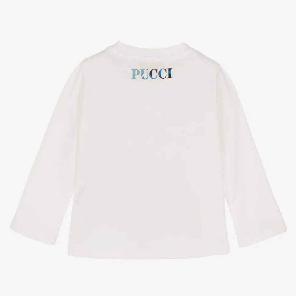 A white top for girls by Italian designer PUCCI, made in soft cotton jersey. The luxury brand, known for their vibrant, bespoke patterns, has styled this top with a blue, pink and black Onde-print patch pocket on the front and stand-out branding printed on the back. Poppers on one shoulder help with over-the-head dressing.