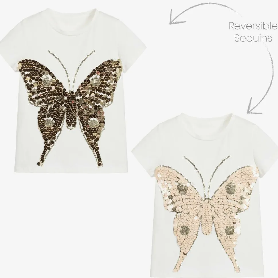Striking off-white T-shirt for girls by Childrensalon Occasions, with a shiny gold and pink butterfly on the front, shimmering with reversible sequins. Endlessly comfortable, it is made in soft, comfortable, cotton jersey and has short sleeves.