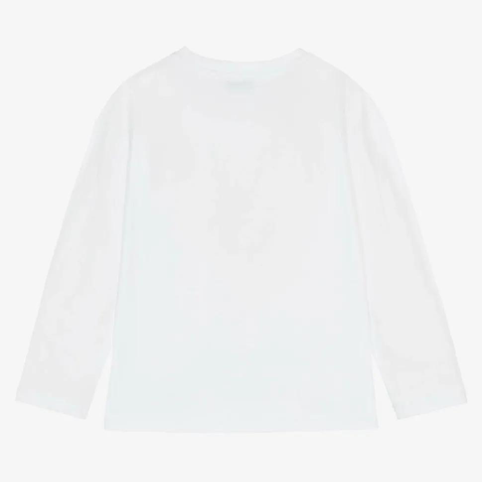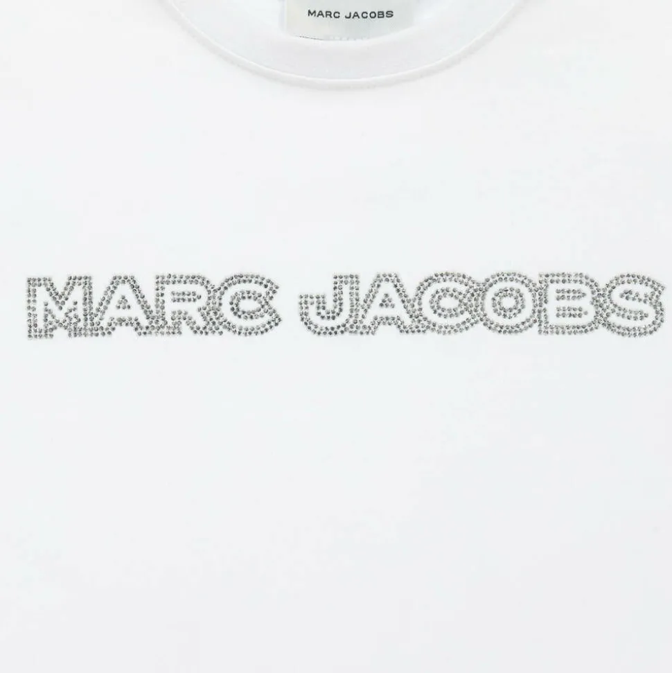 White long-sleeved Mini-me cotton top for girls by MARC JACOBS, made in soft and comfortable jersey. Adding a touch of designer style to this casual wardrobe staple, it has a sparkly diamanté logo across the front.