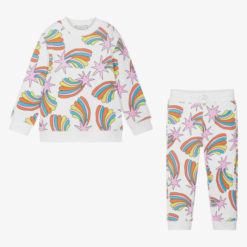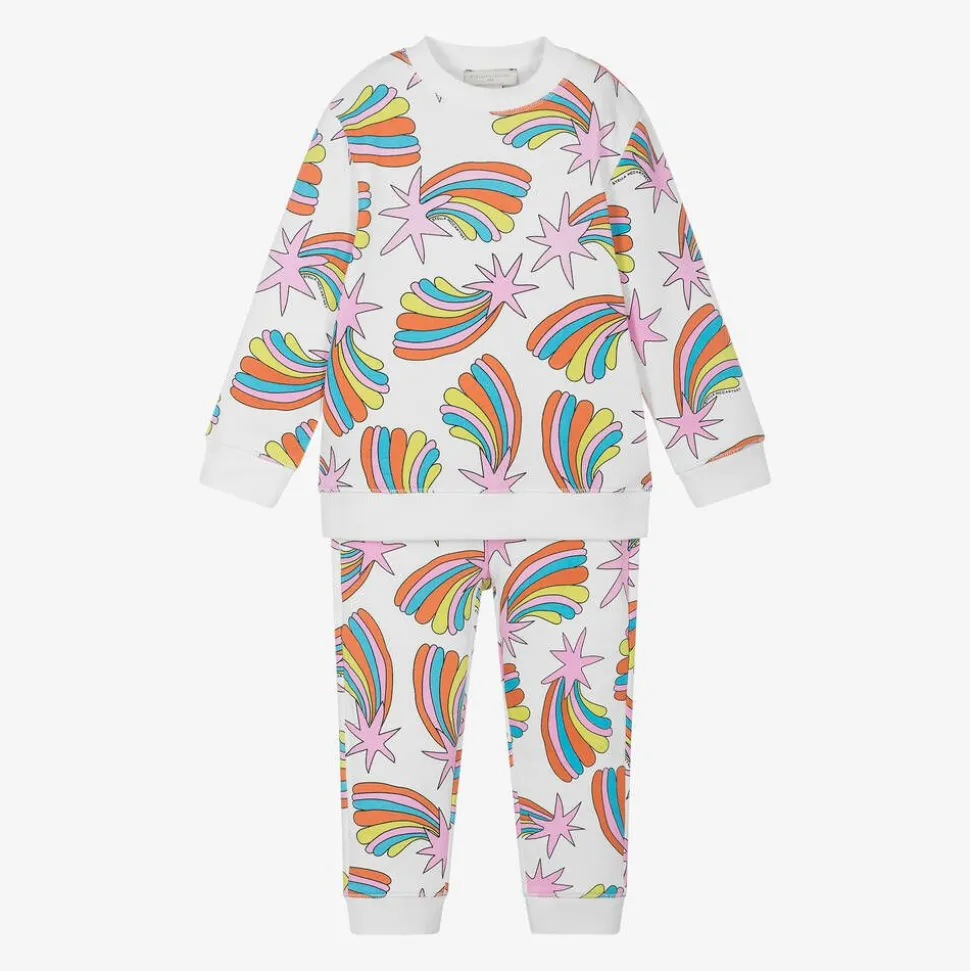 White tracksuit for girls by Stella McCartney Kids, with a vibrant print of pink stars and colourful rainbows. Casual and comfortable, it is made in mid-weight organic cotton jersey, with a cosy fleecy inside. The joggers have an elasticated drawstring waist for an ideal fit, with useful side seam pockets. The Stella McCartney fit can be quite small so choose a size up if you want room to grow.