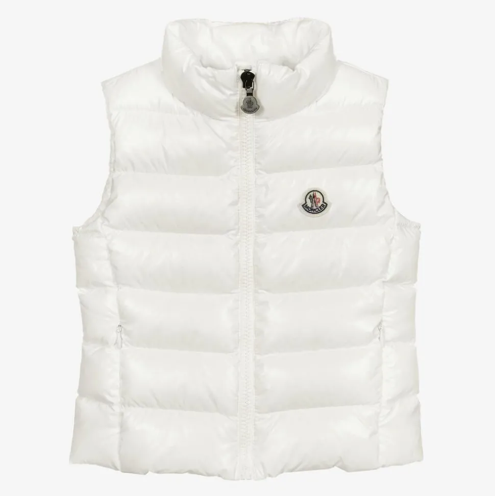 White puffer gilet for girls by luxury French designer Moncler Enfant, padded with lightweight, warm down. Stylish and water repellent jacket, it has the brand's iconic felt logo on the chest and fastens with a logo zip on the front for a luxurious added detail.