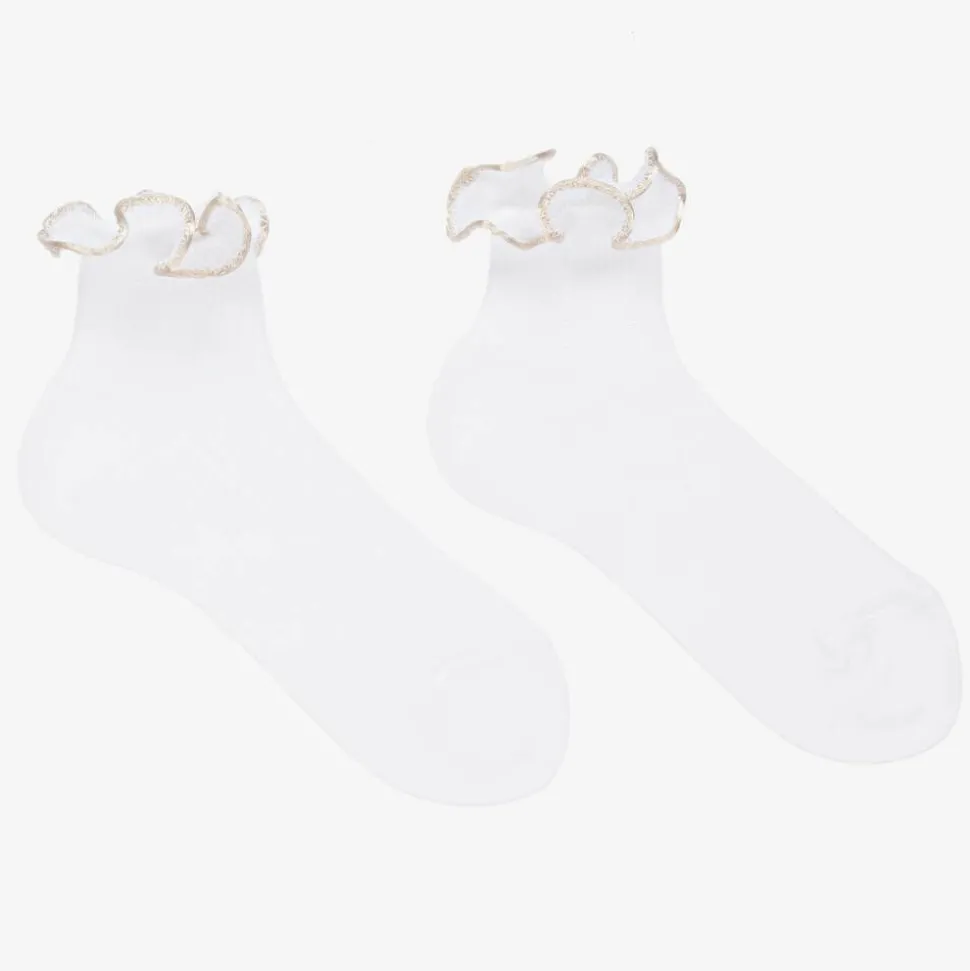 Little girls white socks by Story Loris. Finely knitted in soft cotton, there are ruffles on the ankles, trimmed with pale gold satin edging.