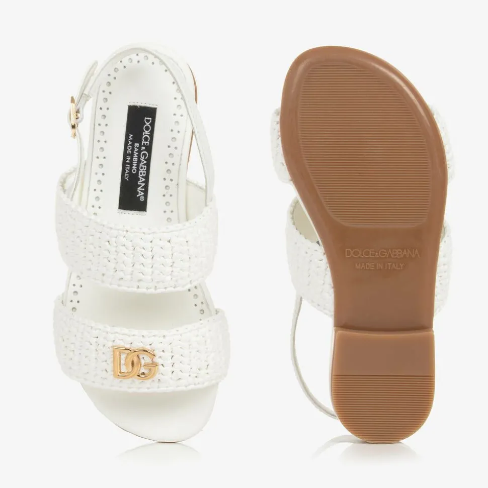 Chic and stylish, these white open-toe sandals for girls by luxury label Dolce & Gabbana, are made in the finest leather with raffia crochet detailing. There is a gold-tone DG logo on the front adding a distinctive designer look and to ensure a comfortable fit, they have an adjustable buckle-fastening ankle strap. They are lined in soft leather and have a lightly padded, perforated insole for lasting comfort. The slim, non-slip rubberised outer sole has a small heel and adds a sleek finish to this elegant design.