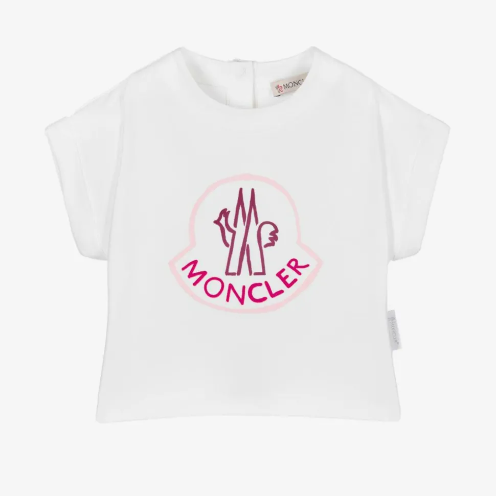 Casual white T-shirt for little girls, by luxury French brand Moncler Enfant. Made from super soft cotton jersey, it has the brand's signature rubberised logo printed on the front in pale pink and purple, and turned-up short sleeves.
