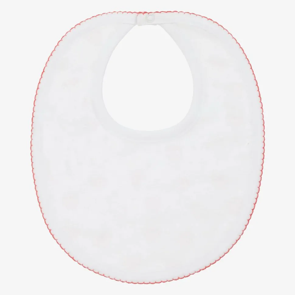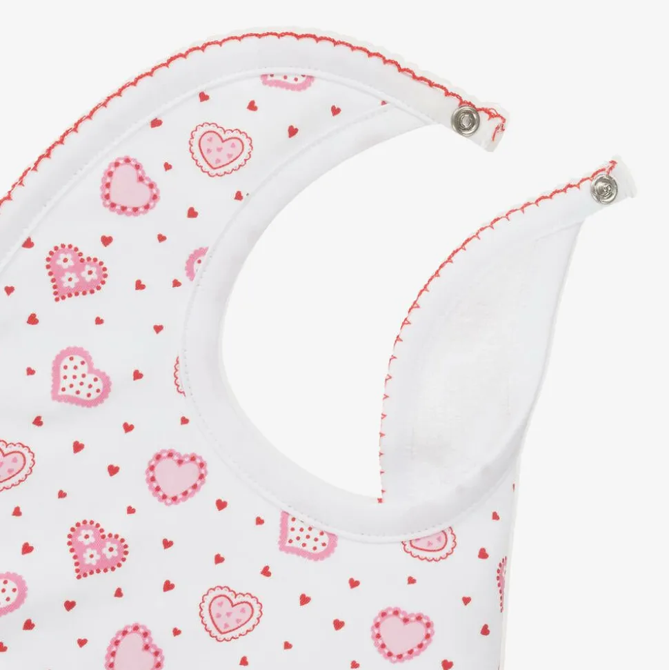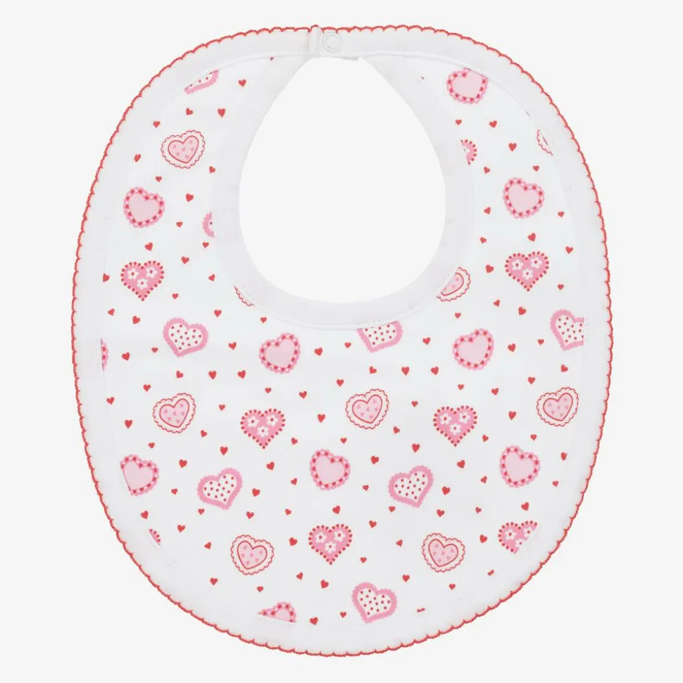 White bib for baby girls by Kissy Kissy, patterned in pretty pink and red hearts, with picot embroidery trim. Made in super soft Pima cotton jersey, it has an absorbent towelling lining and fastens with a single popper.
