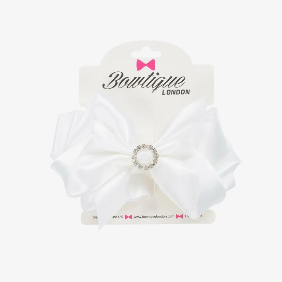 Girls elegant white satin bow hair clip by Bowtique London. It has a glamorous diamanté ring in the middle for a touch of sparkle and is set on a metal clip fastening.