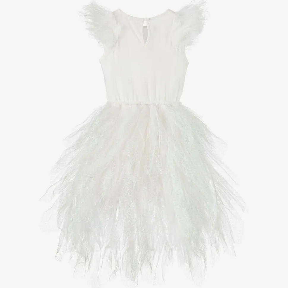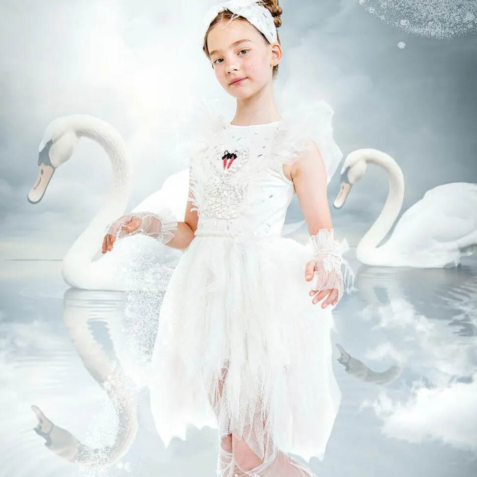 Stunning white swan lake costume dress for girls by Tutu du Monde, made in lightweight tulle with a soft cotton lining for comfort. Two embracing swans created from beads, sequins and feathers adorn the bodice for a sweet, eye-catching look, whilst the layered tulle skirt has iridescent thread throughout which catches the light beautifully. A single button fastening secures the key hole detail on the back for a pretty finish. Items are made to last and become more lovely with wear as slight fading and fraying edges adds to their charm.