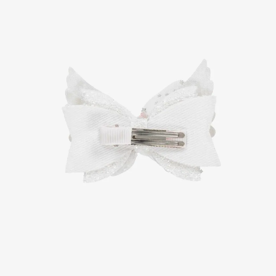 White bow hair clip for girls, by Bowtique London. It has lovely sparkly, textured trims with a sweet unicorn character for a playful touch. There is a metal slide fastening on the back for easy dressing.