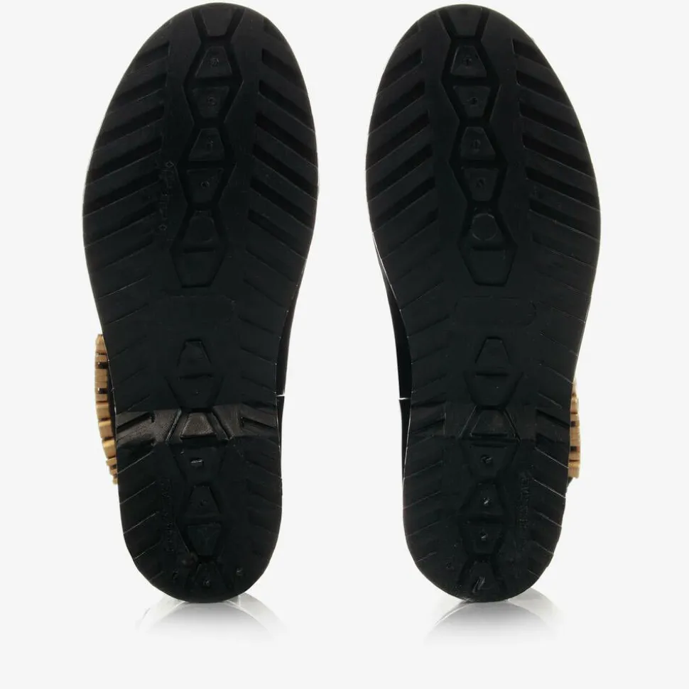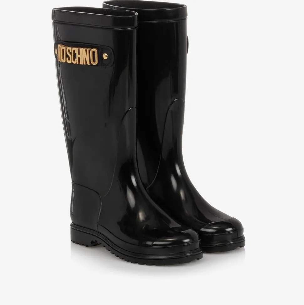 Stylish black rain boots for boys and girls by Italian brand, Moschino Kid-Teen. For instant designer appeal, there is gold-tone logo lettering on leather straps on the side of each shoe. Made in a high-shine PVC with rounded toes, they have moulded rubber outer soles for a good grip and a soft fabric lining for comfort.
