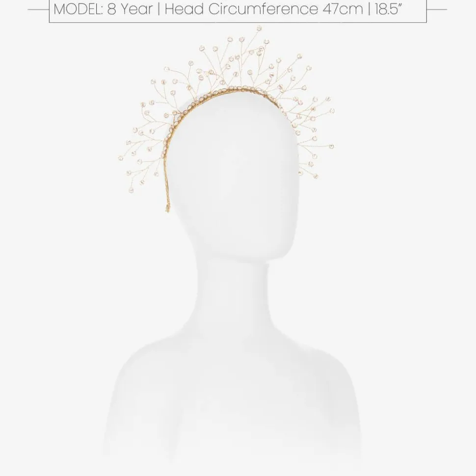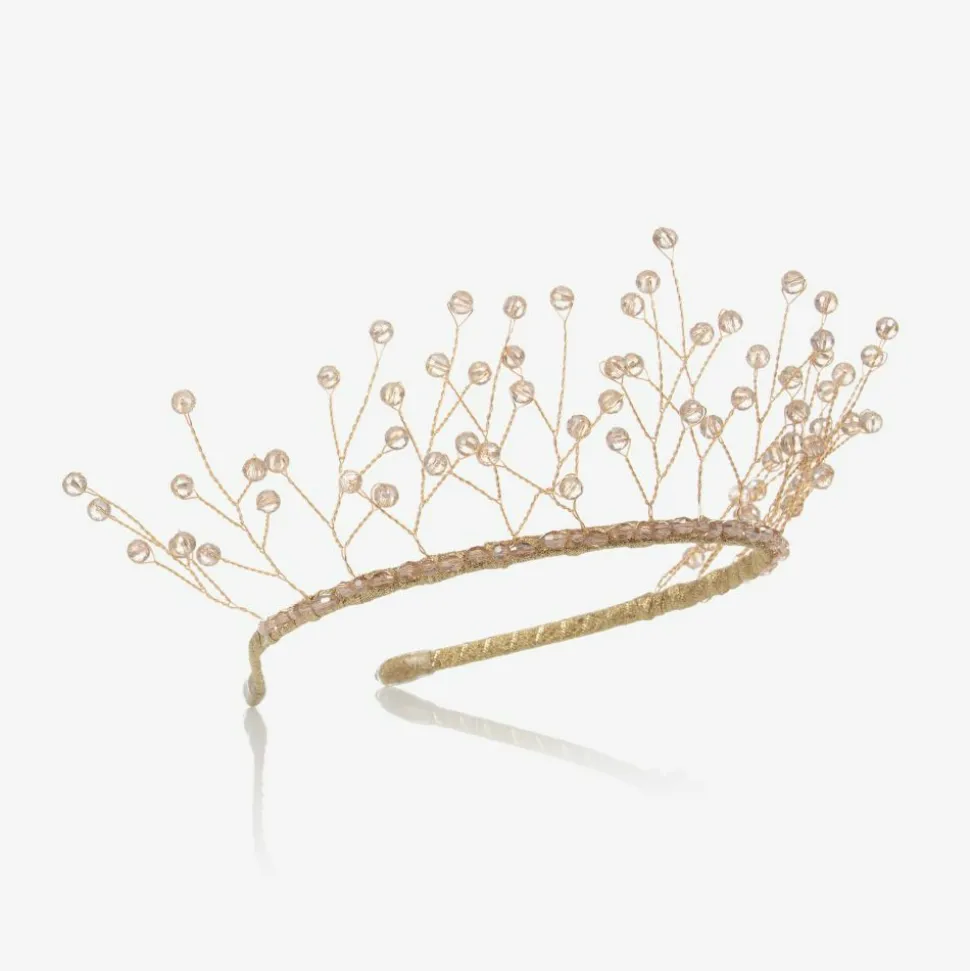 A beautiful gold filigree tiara for girls by Sienna likes to party. Decorated with sparkly crystal beads, this handmade 'Micheangela' hair accessory has a gold foil-wrapped metal band topped with delicate twisted wires.