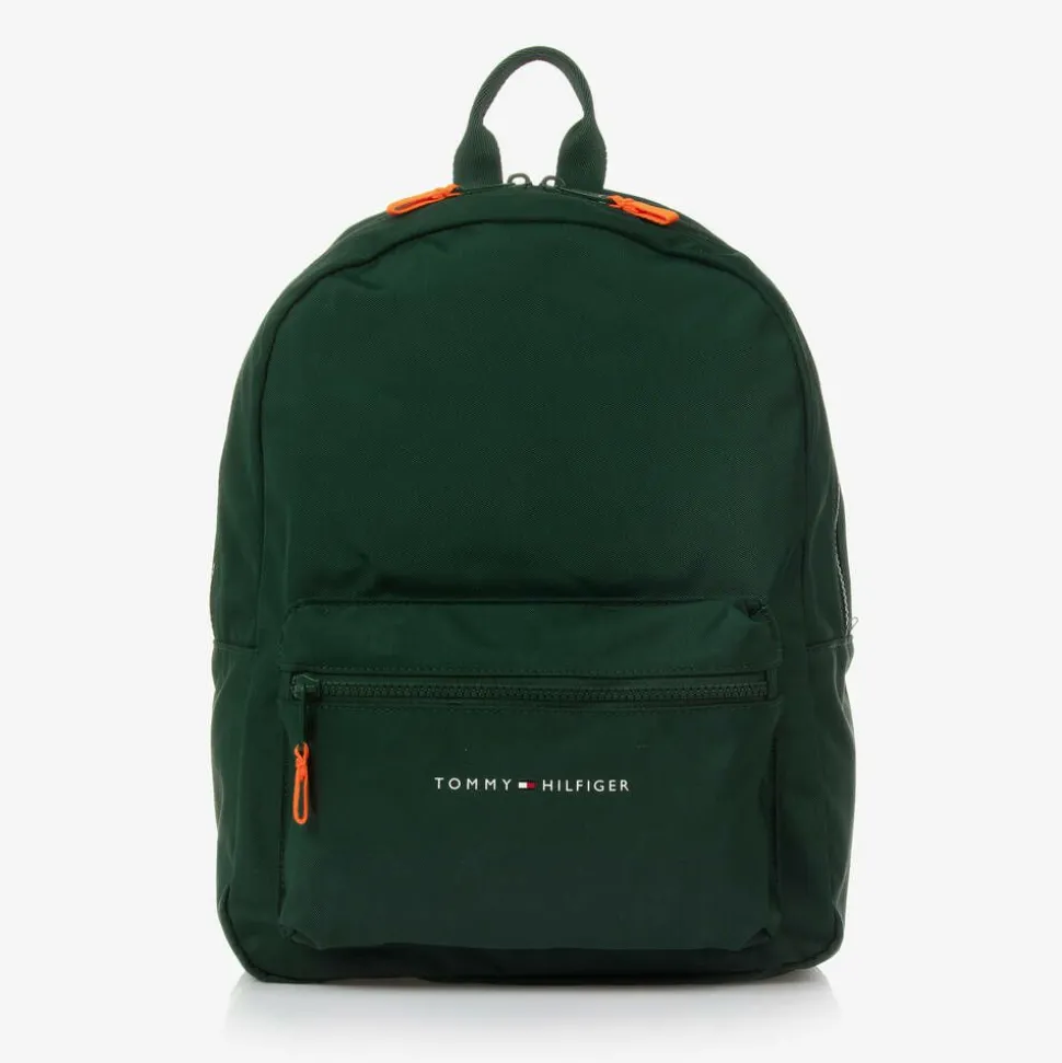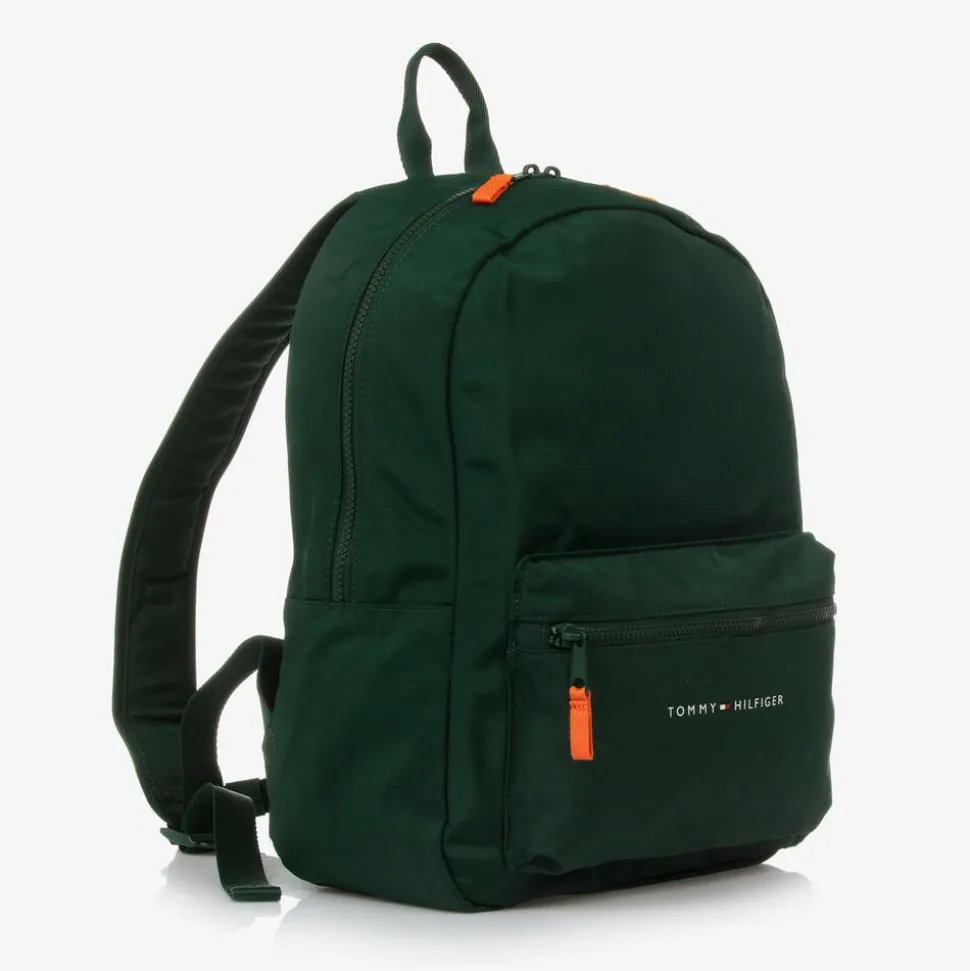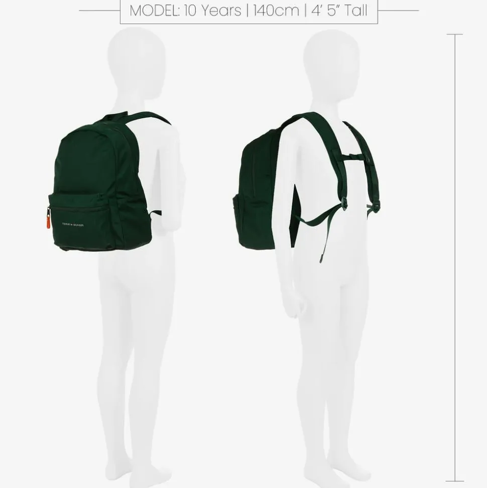 Dark green backpack for boys and girls by American brand Tommy Hilfiger, made in strong, durable canvas. Comfortable to wear, it has a padded back panel, adjustable, padded shoulder straps, connecting with an adjustable chest strap for extra support, and a useful carry handle on top. There is a zipped pocket on the front, with a white logo and the signature flag motif, and a large main compartment with an elasticated slip pocket. The outer material of this product is made with at least 95% recycled materials.