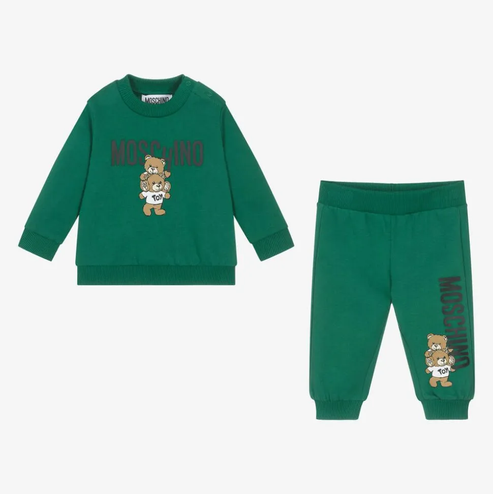 Dark green tracksuit for little boys and girls by Moschino Baby, made in soft cotton jersey for comfort as well as style. The long-sleeved sweatshirt has a playful logo print on the chest with two cuddly Moschino Teddy Bears. Great for layering, it has ribbed trims and easy shoulder poppers on one side. Matching joggers, with a stretchy ribbed waistband, are easy to pull up and take off.