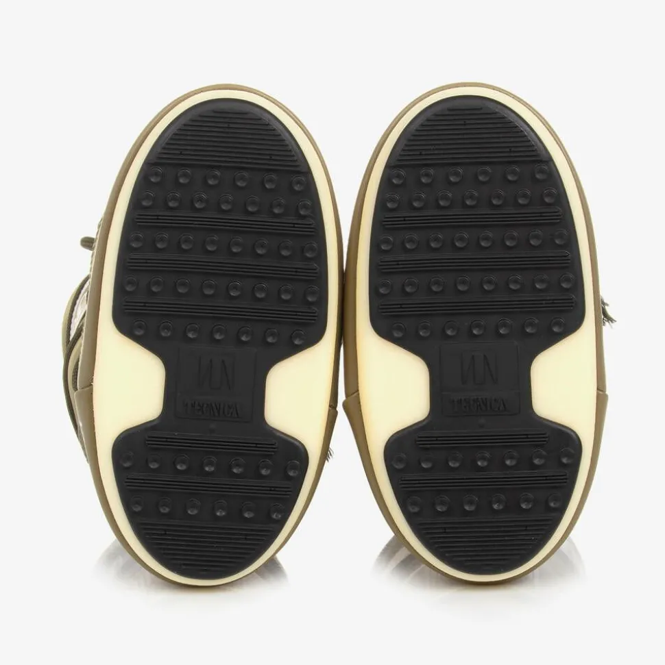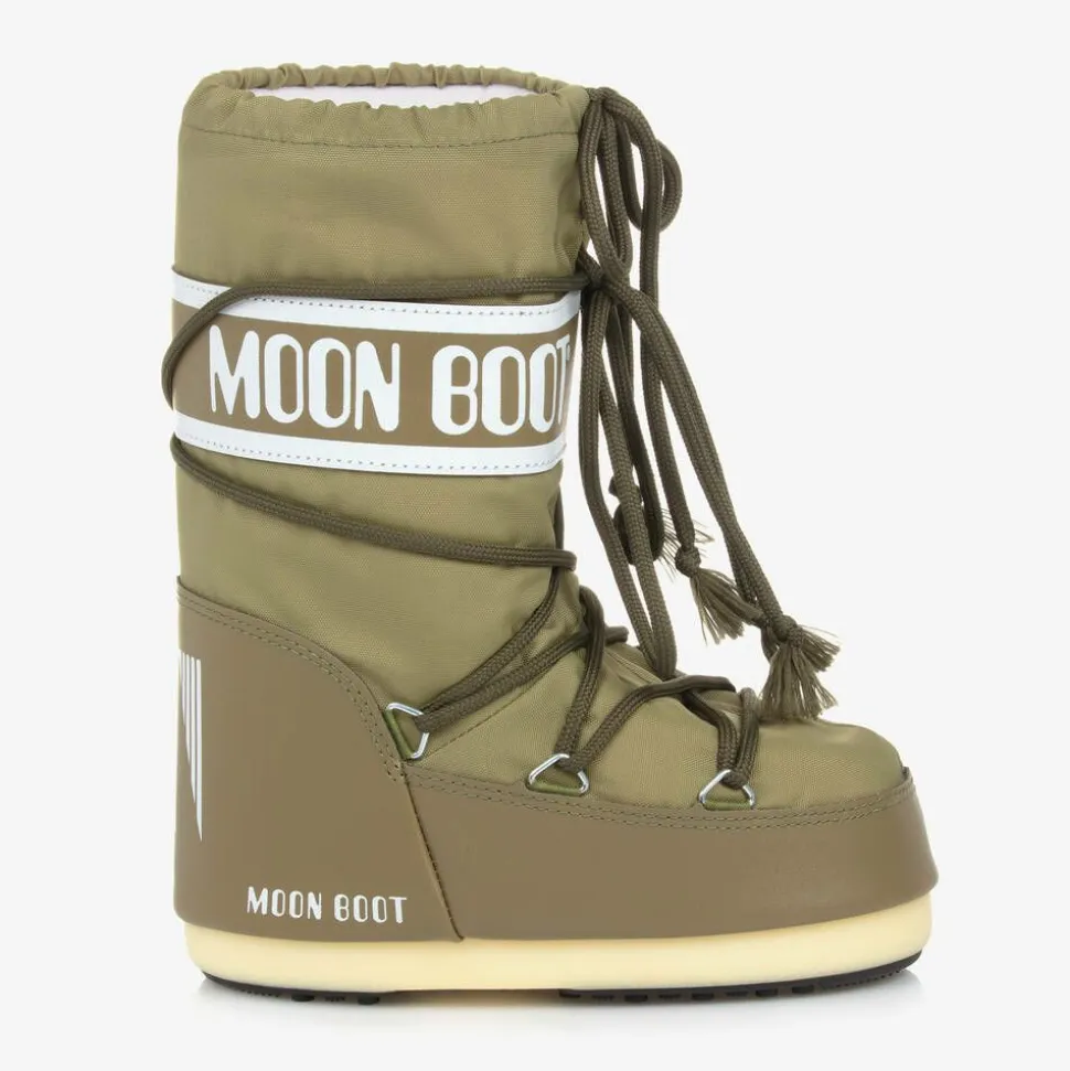 Khaki green snow boots for boys and girls by Moon Boot, with a white logo print panel for a bold, branded look. Heavily padded and ultra resistant in the original style, they feature a two-tone thermoplastic sole with little suction pads at the bottom for improved grip. They have faux leather trims, a stylish lace-up look and a drawstring ties on the ankles to lock in warmth. The technological foam lining will feel snug at first but will mould to the size and shape of the foot after a few hours of wear.