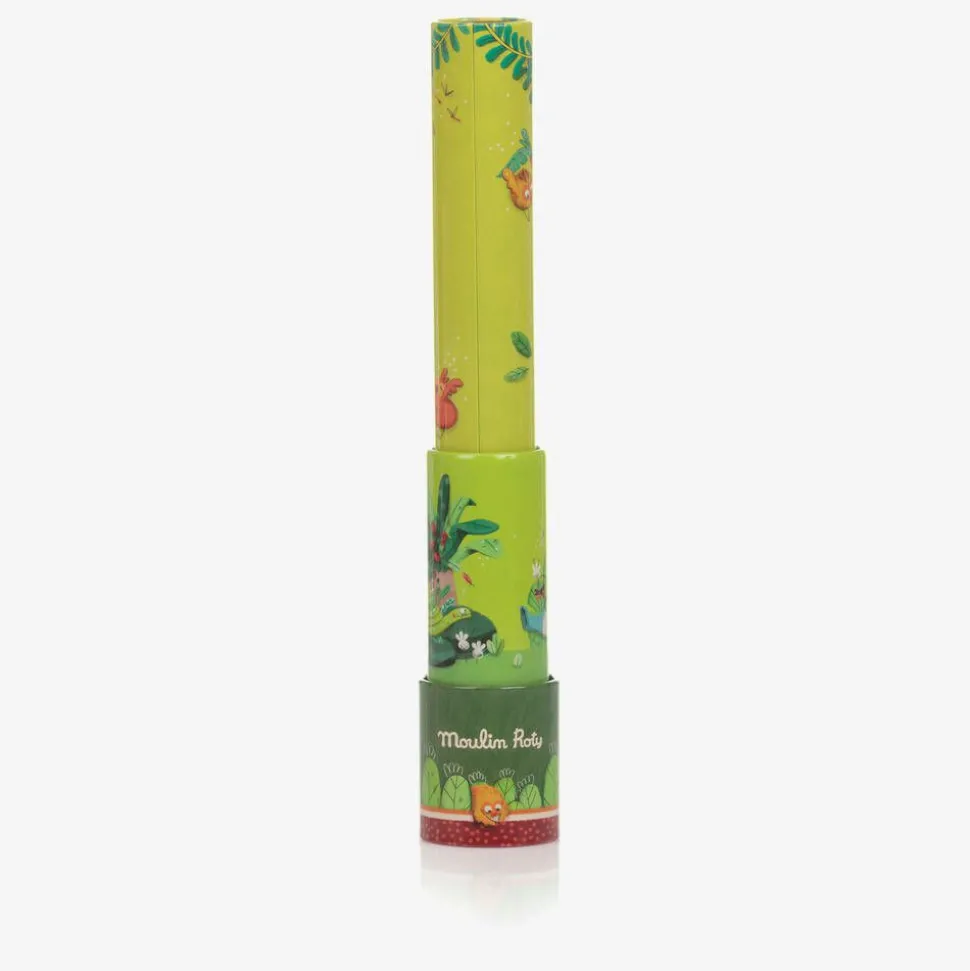 A green telescopic kaleidoscope for boys and girls by Moulin Roty, printed with a fun jungle-themed design. Easily viewed through the lens, the colourful beads inside move to form beautiful patterns when the kaleidoscope is twisted. Endless fun, this toy is great for visual stimulation and boosting their creativity and imagination.