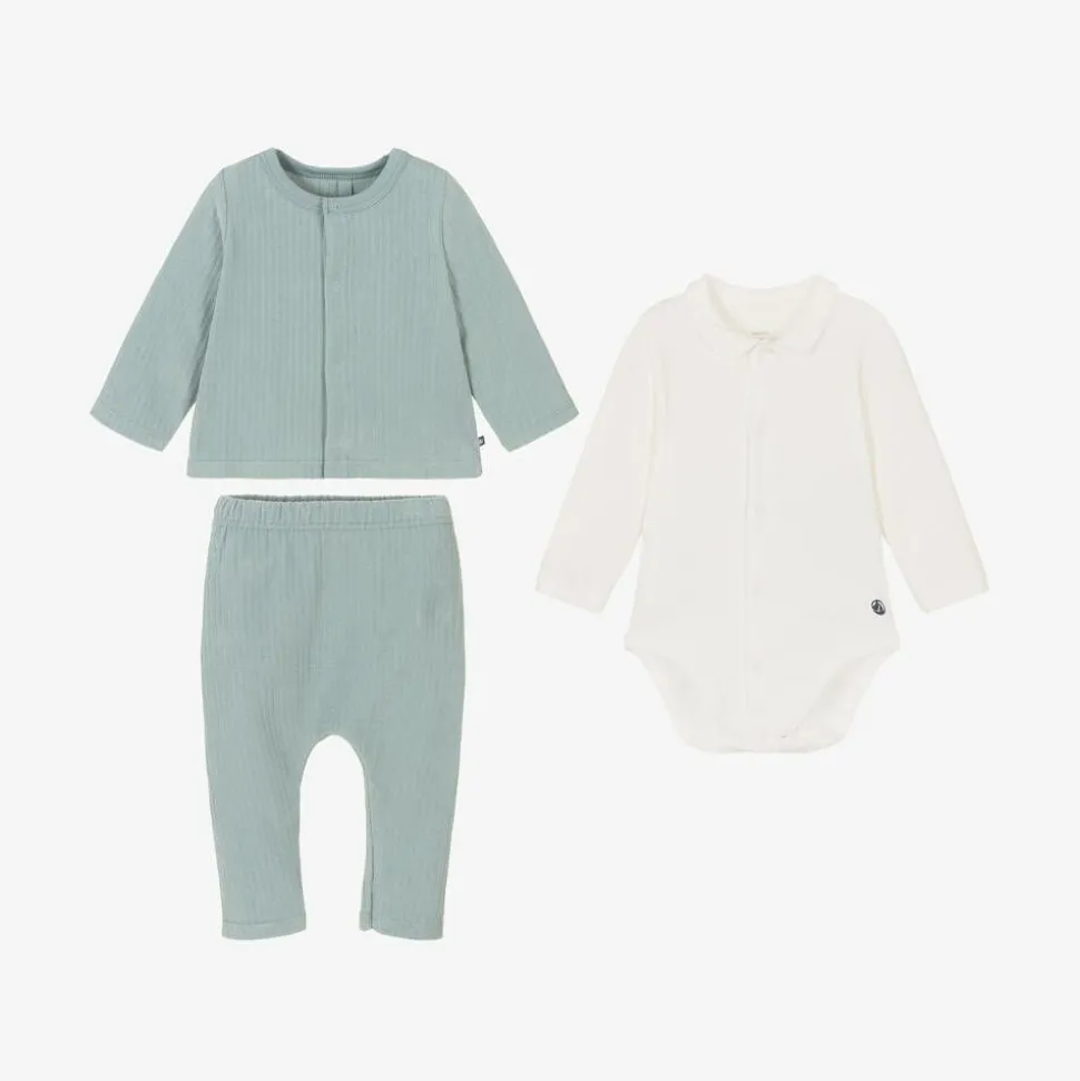 A green and ivory organic cotton trouser set for baby boys and girls by Petit Bateau. The long-sleeved top fastens with poppers on the front and the matching trousers have a gently elasticated waistband. They are both made in soft ribbed velour for comfort. A useful ivory bodyvest completes this lovely outfit. It has a sweet collar, long sleeves and popper fastenings on the front and between the legs for quick dressing.